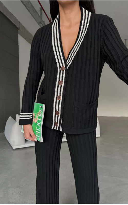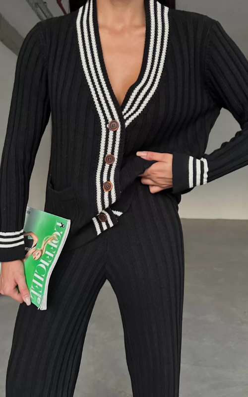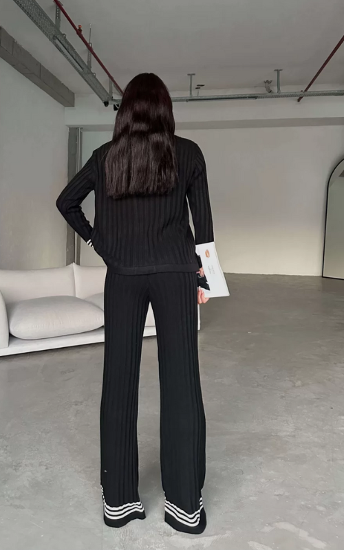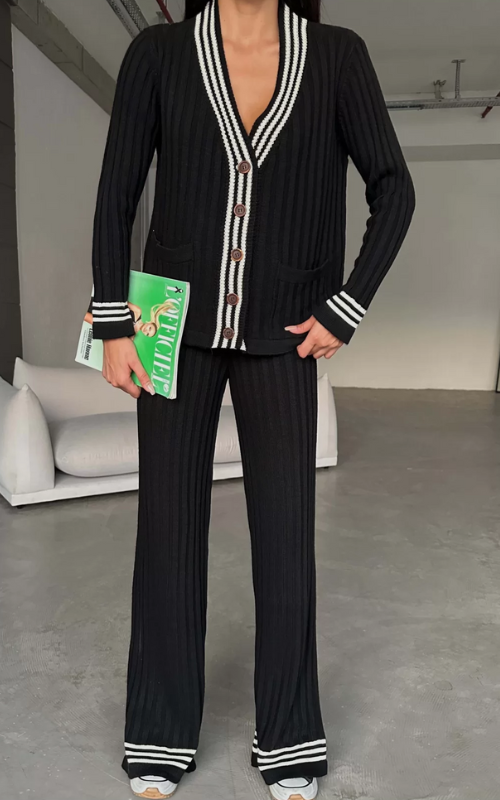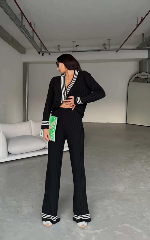 Our Button Elegance Set features bold contrast black stripes along the edges, the top includes front buttons for a classic look, while the flared bottoms offer a stylish, flowy silhouette.