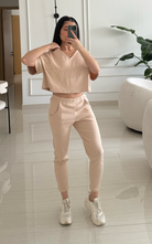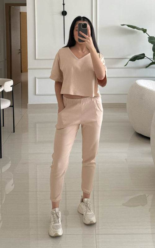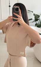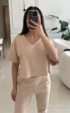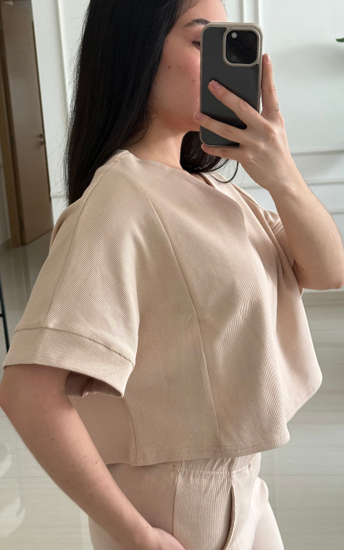 Cropped short sleeve tee in ribbed fabric with a subtle V-neck and dropped shoulders. Sleeves are finished with a clean ribbed hem. The fabric contains organic cotton and elastane.