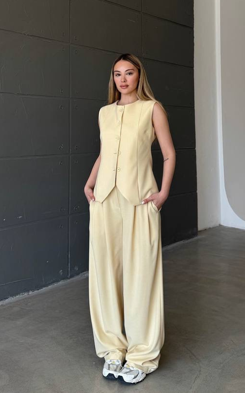 The Christina Set features a chic high round-neck vest paired with tailored straight-cut pants with a classic button closure—perfect for a refined, modern look.