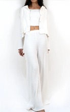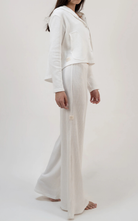 Ultra-comfortable white cotton pants with soft vertical stripes and a mild flared hem, made to fit and flatter every body type.