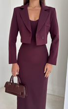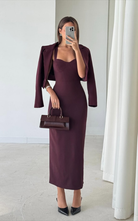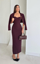 Elegant set featuring a structured bustier dress in midi length, paired with a cropped blazer