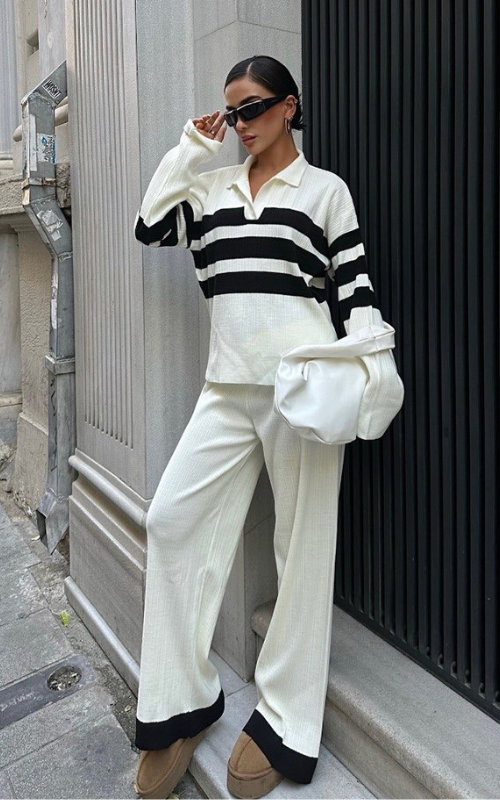Our Donna Set showcases a bold contrast color design with a horizontal line pattern and chic collar, creating a modern and stylish look.