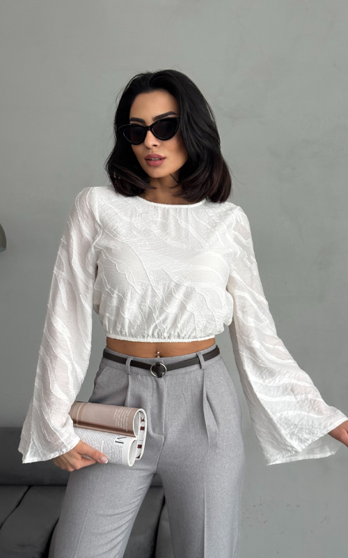 Our Dove Top features a luxurious textured satin fabric, long sleeves with a slight wide wrist cuff, and an elastic waist edge, combining elegance and comfort for a chic look.