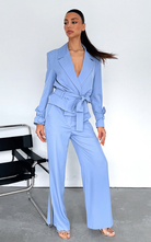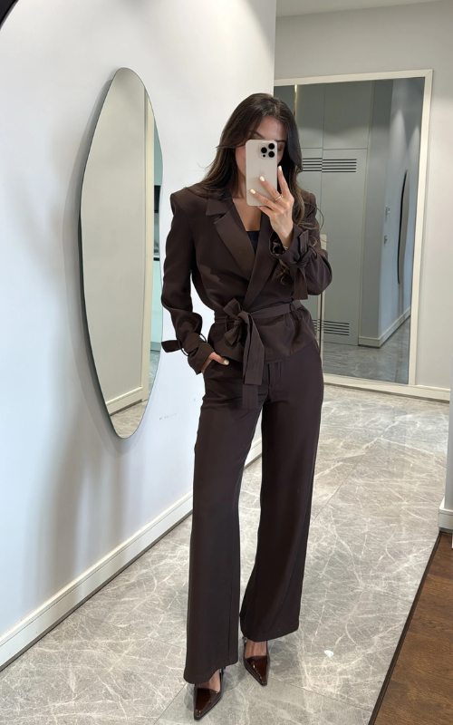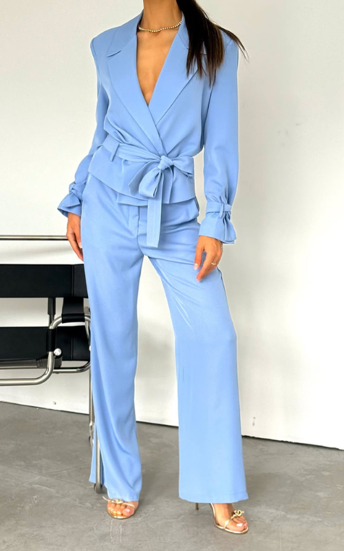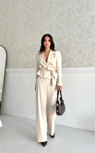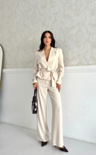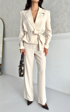 The Elena Set features a structured blazer with padded shoulders, waist and wrist belts for a tailored fit, paired with straight-cut pants complete with pockets—delivering a polished and powerful look.