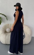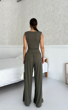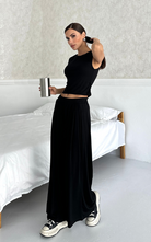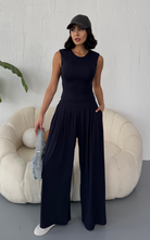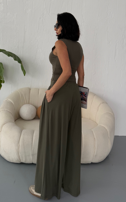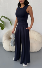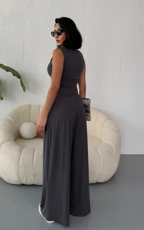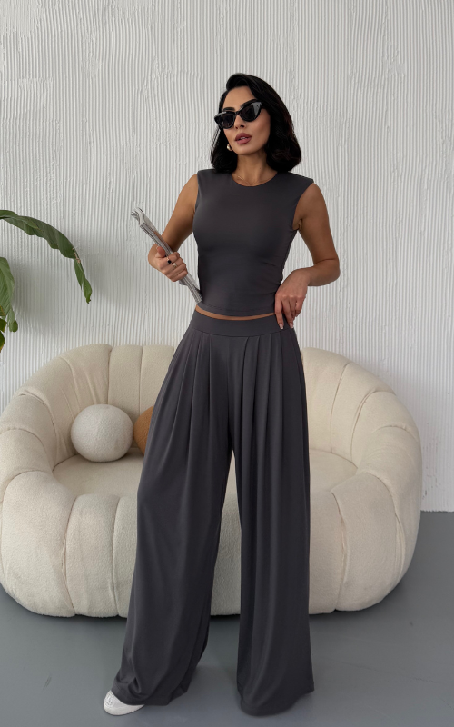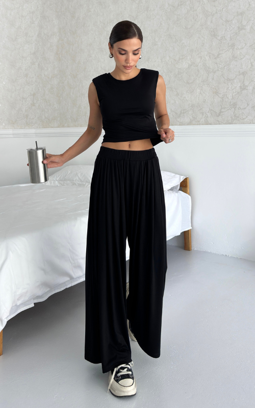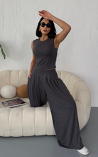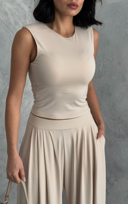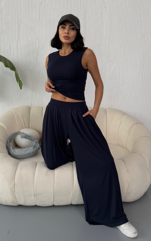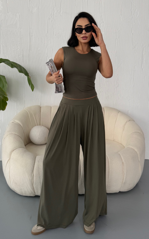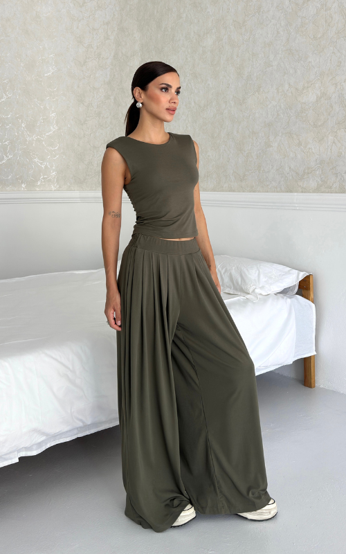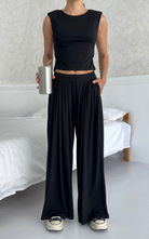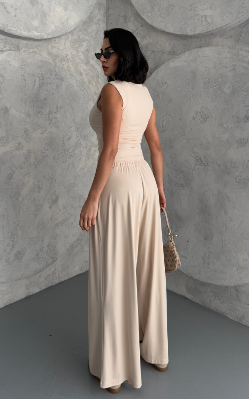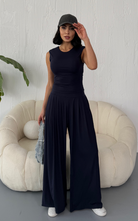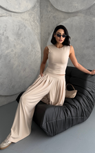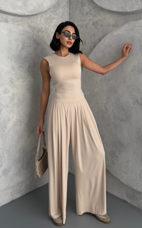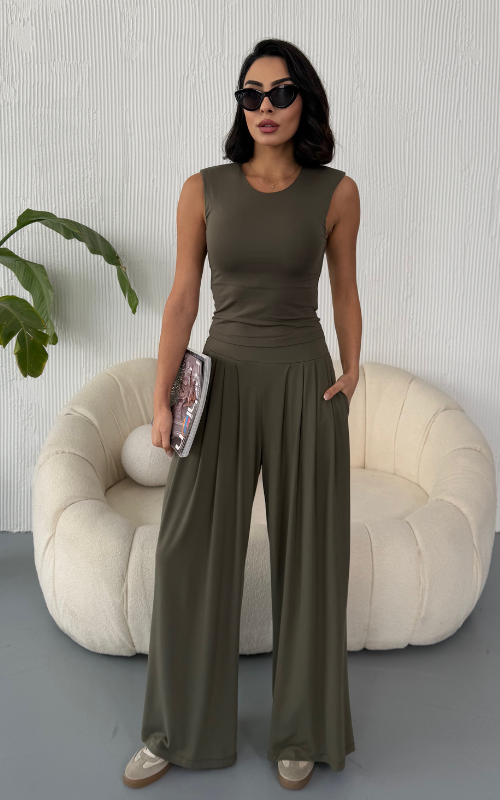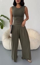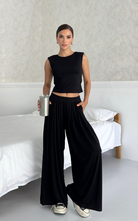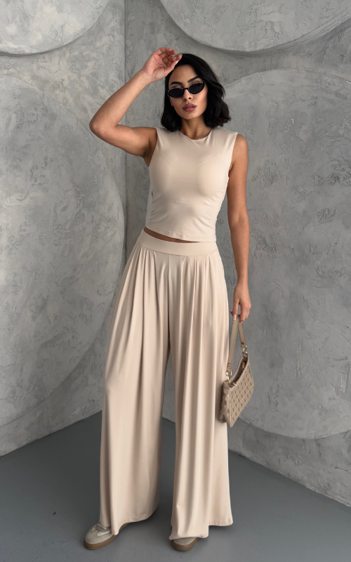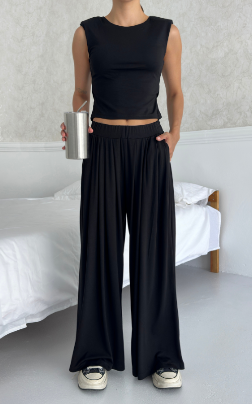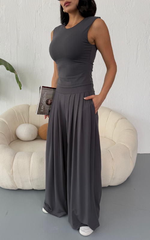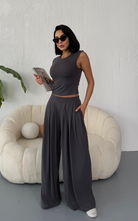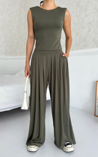 Made from body-hugging fabric, the Ellen Set features a sleeveless, high-round neckline fitted top and pleated, flowy pants with pockets. it offers both comfort and style.