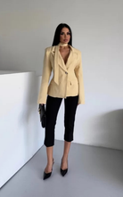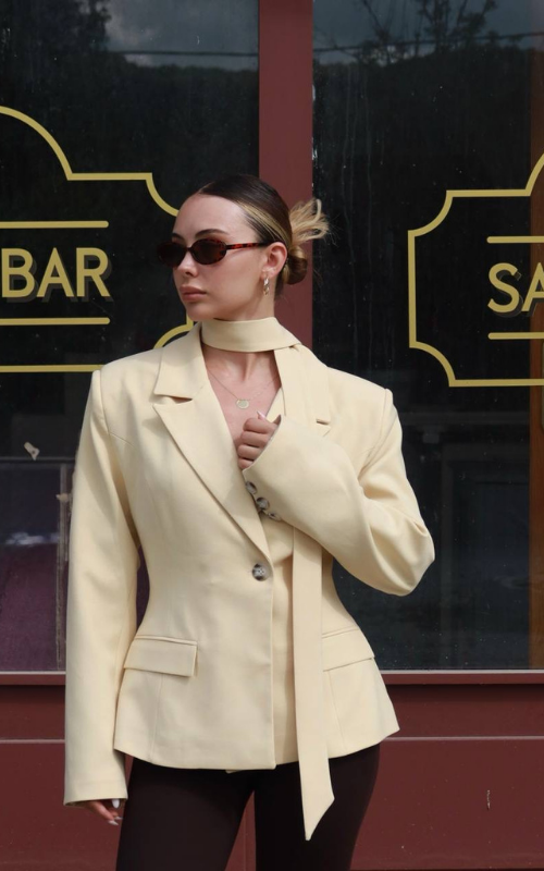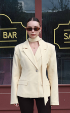A sharply structured blazer with padded shoulders that accentuate the silhouette and create a cinched waist effect. Designed with a single-button closure, flap pockets, and a coordinating scarf for a refined touch.