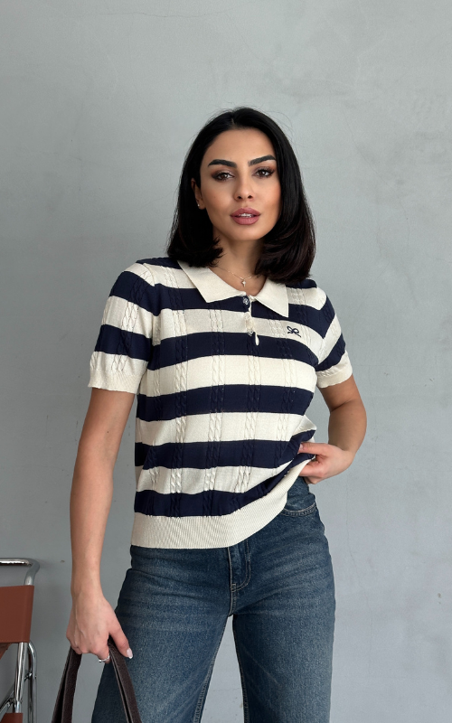 Our Femi Top is a striped polo shirt that features a cute embroidered ribbon on the front, along with a well-made collar and buttons, blending classic style with a playful touch.