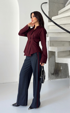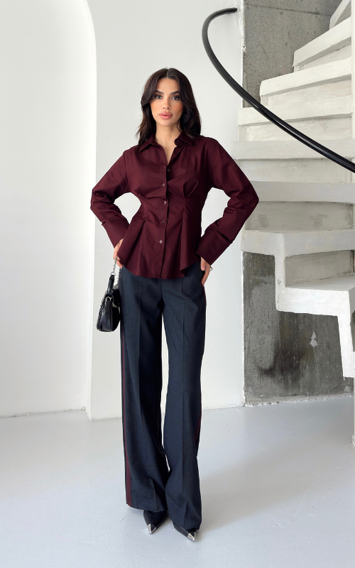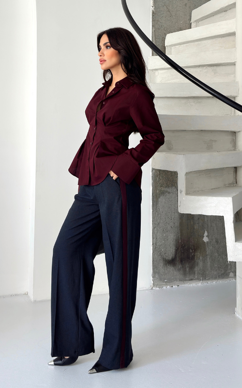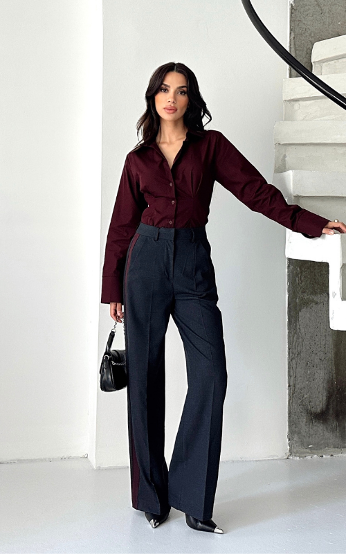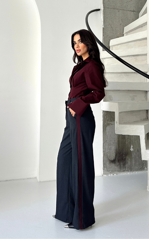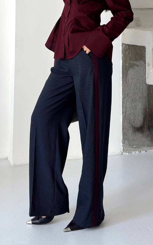 Wide leg, high waisted pant with front pockets. Decorated with a contrasting side strip in different color for a modern touch.