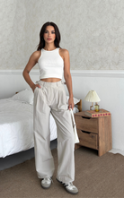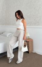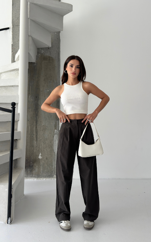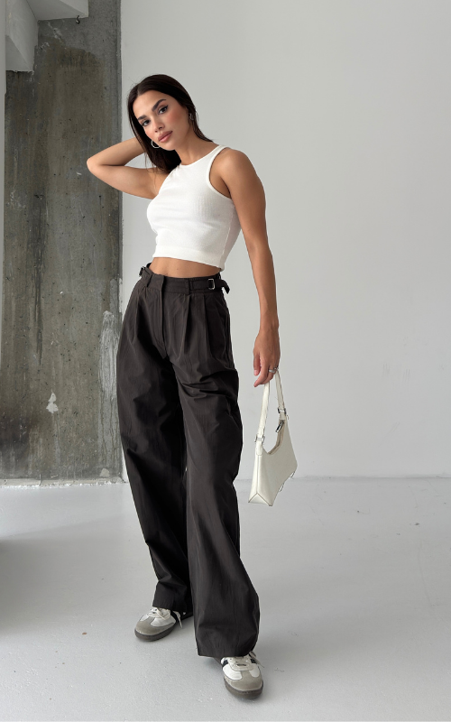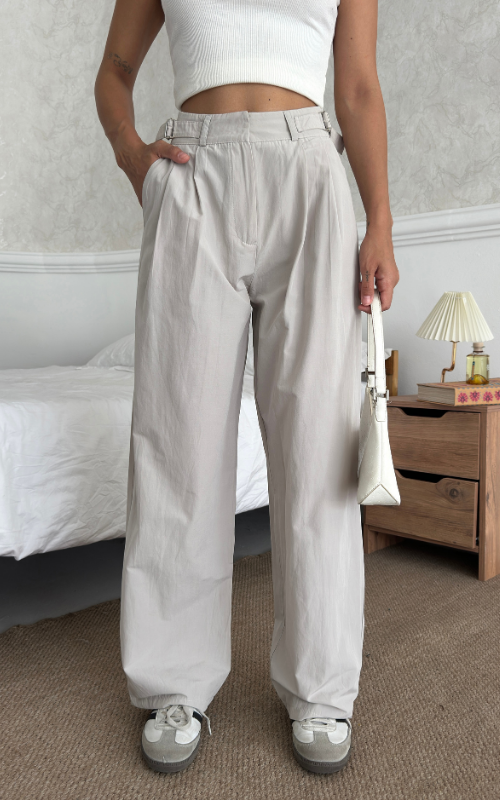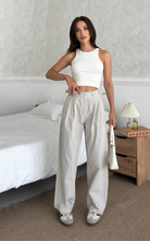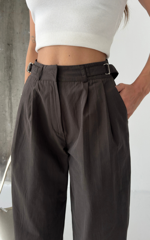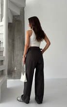 The French Pants features a high-rise waist with front pleats. Designed with a relaxed, tapered leg, side pockets and a matching self-fabric belt strap with loops.