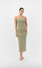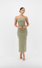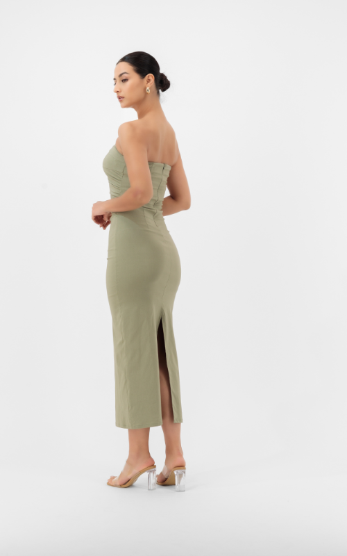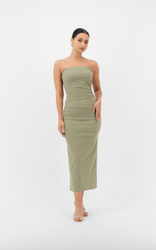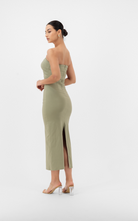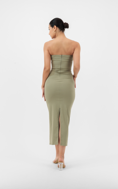 A sleek body-hugging midi dress, designed with elegant rouched bodice. Featuring a back slit for ease of movement and a concealed zipper closure, it balances sophistication with a modern, flattering silhouette.