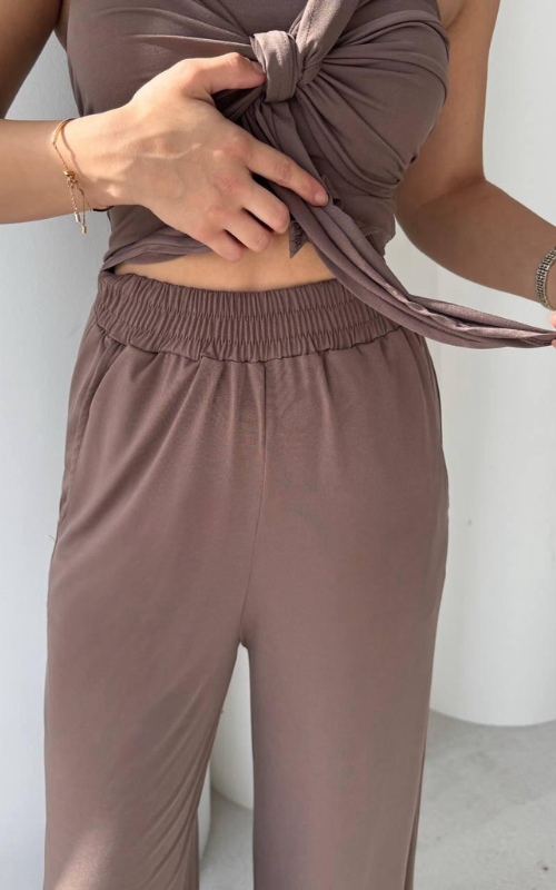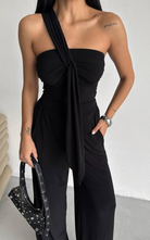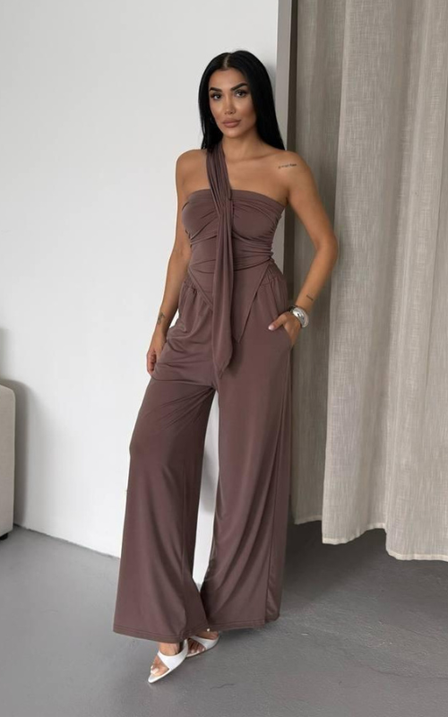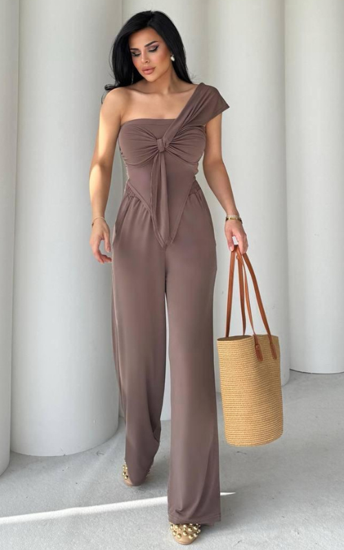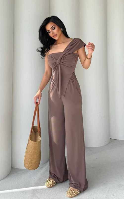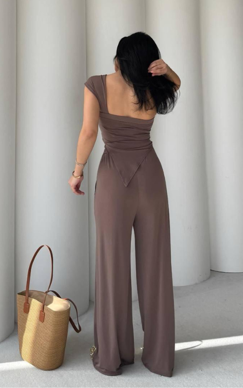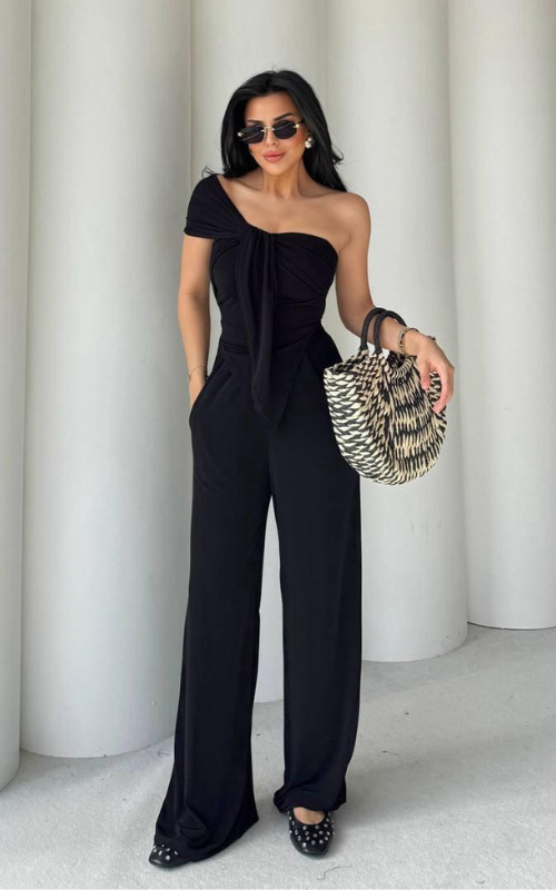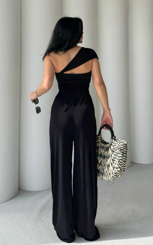 Our Gaya Set features a multi-way asymmetrical neck ruched top with a unique triangular front design, paired with high-waisted pants with a comfortable drawstring waistband.