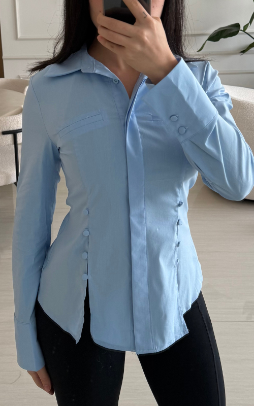 Fitted shirt with front darts, two adjustable slits with buttons for versatile styling, and two sleek welt pockets for a polished look.