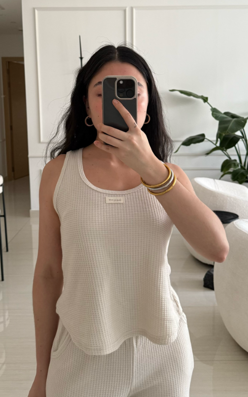 Waffle knit sleeveless top with a round neckline, relaxed fit, and slightly oversized armholes for a comfortable, effortless look. The fabric contains organic cotton and elastane.
