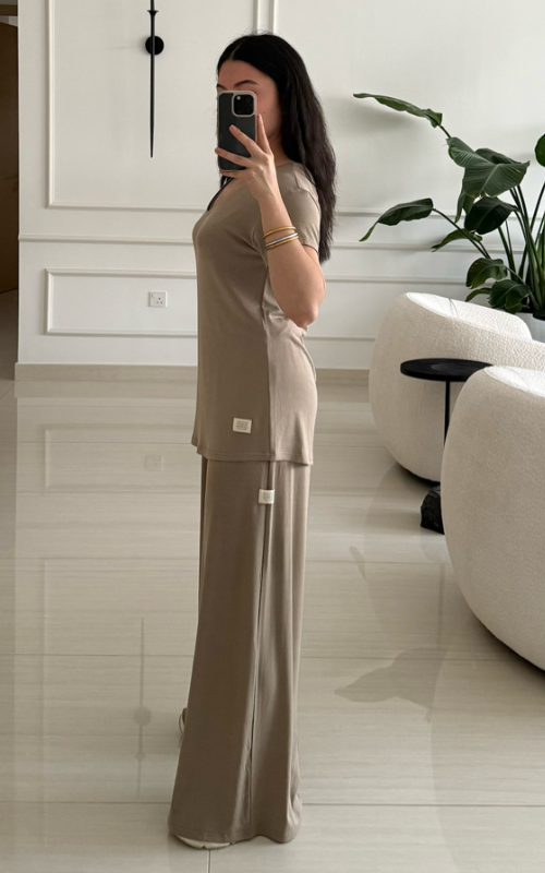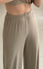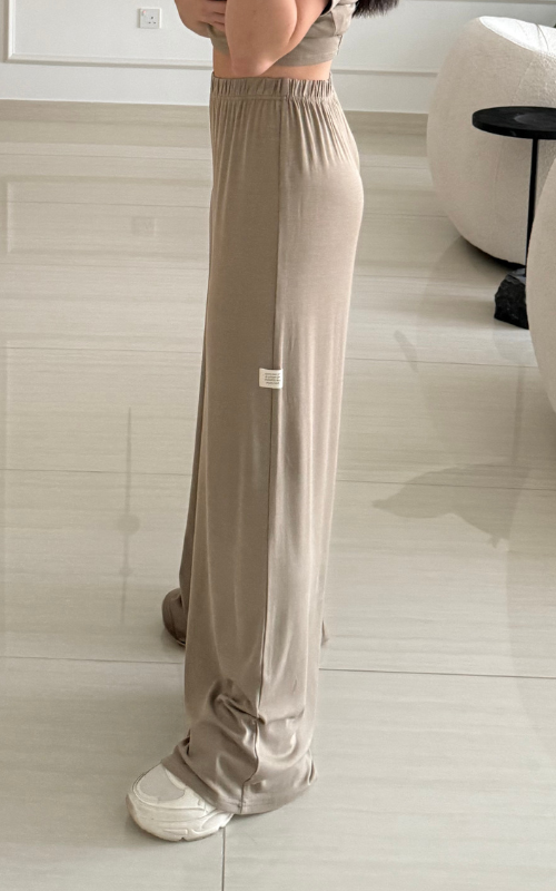 Wide leg pant featuring a thin elasticated waistband. The fabric contains organic cotton and elastane.