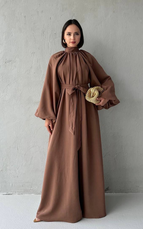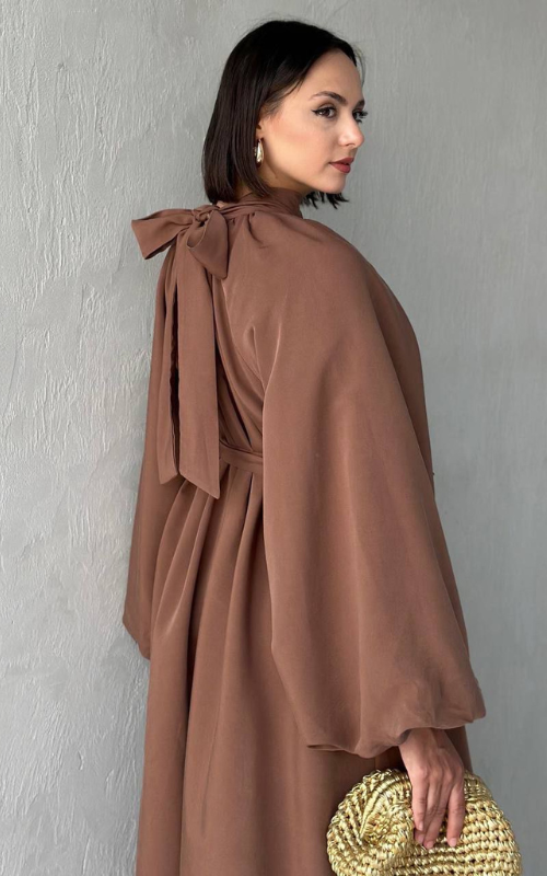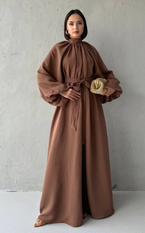 The Island Dress is a soft, flowing dress designed with a high gathered neckline and relaxed balloon sleeves for a refined yet comfortable look.