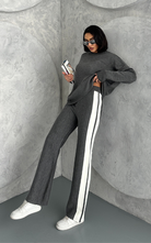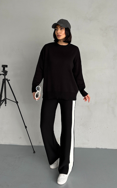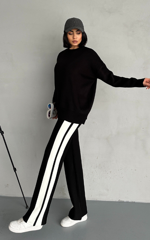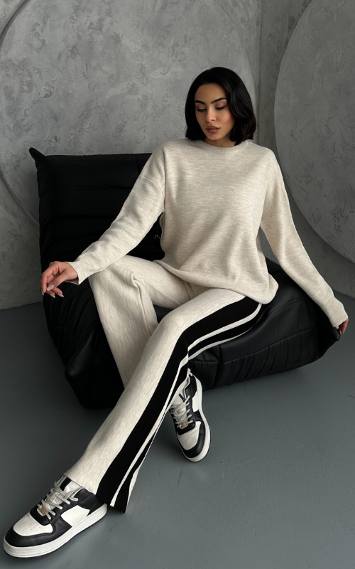 The Jersey Set features an oversized knit design with stylish stripes on the sides of the pants. Perfect for a chic and comfortable look!
