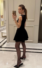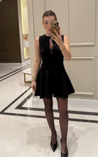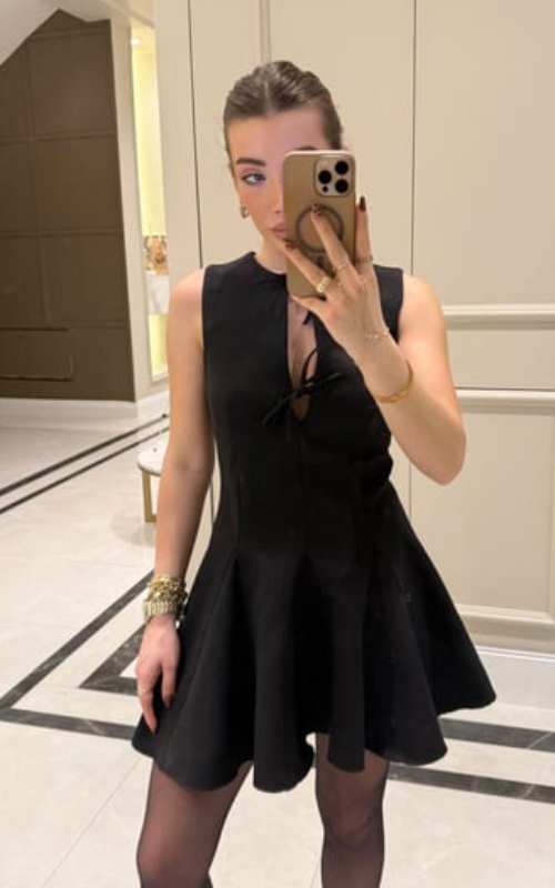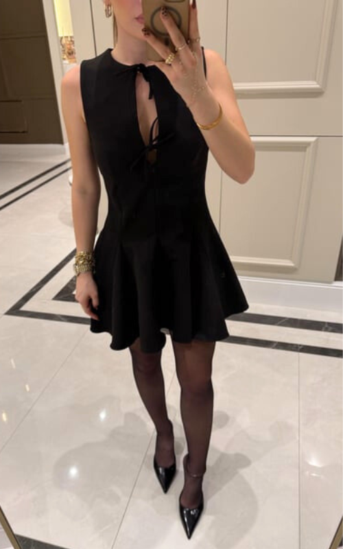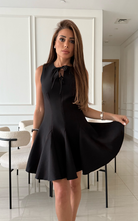 A feminine and flirty sleeveless mini dress featuring a fitted bodice with bow-tie detailing at the chest. The structured seams flow into a flared, pleated skirt.