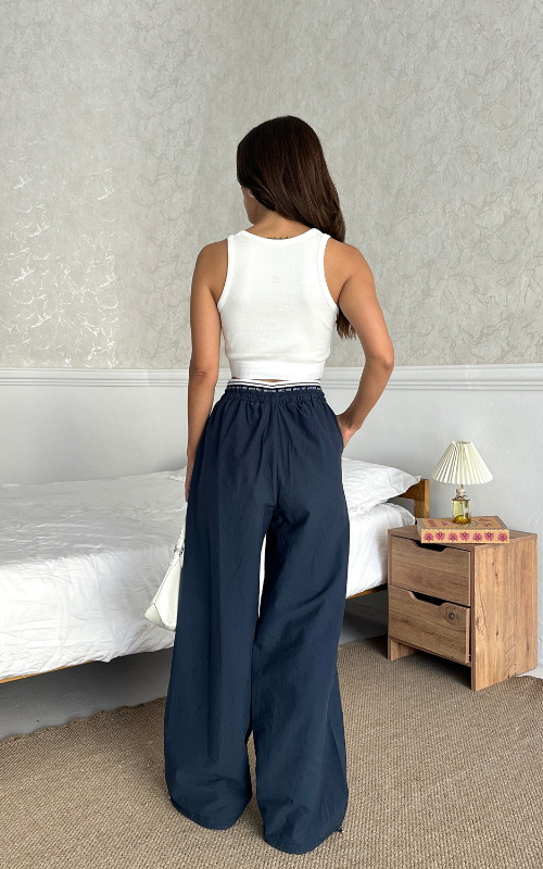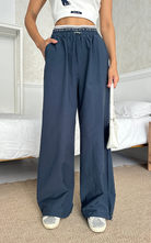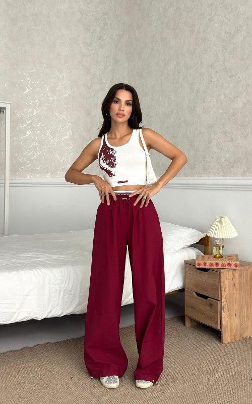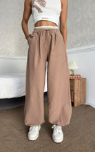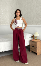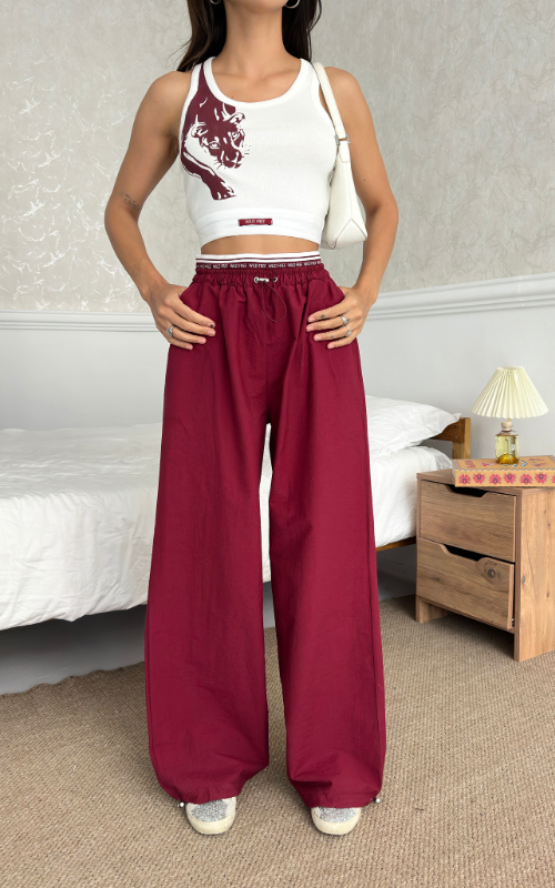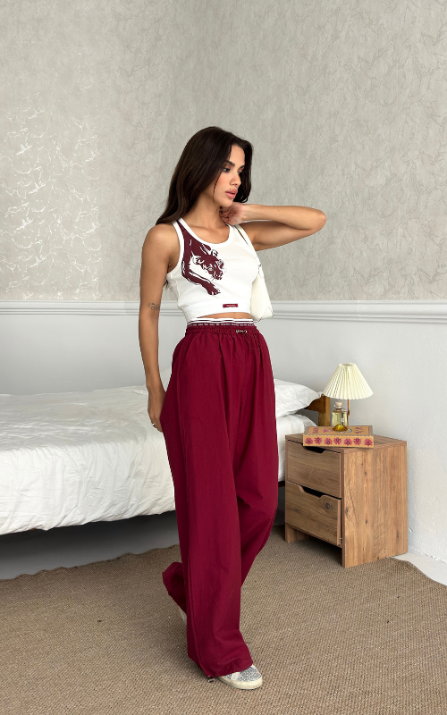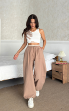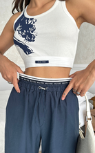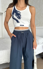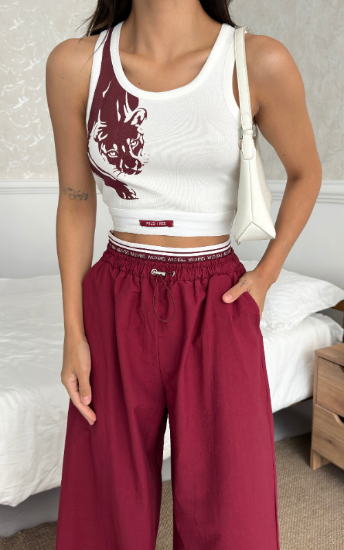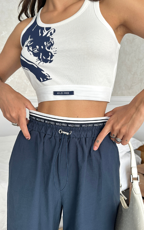 The Juno Set features a top with a tiger print, paired with straight-cut pants designed with a striped elastic waistband for a sporty edge. Finished with side pockets and adjustable hem straps.