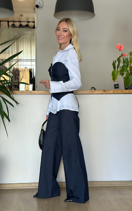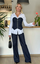 The sculpted corset top features a sharp sweetheart neckline, front zip closure, flap pockets, and a lace-up back for a customizable cinch. Paired with sleek, straight trousers that balance the look with effortless sophistication. Modern, bold, and unapologetically feminine.
