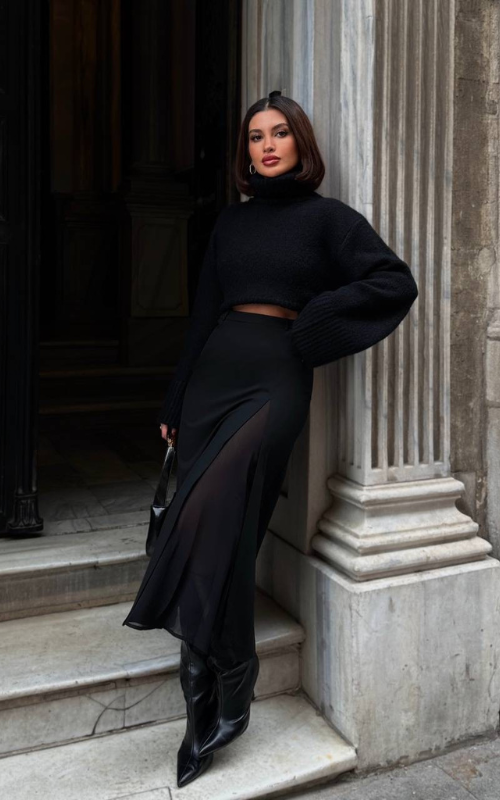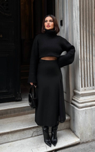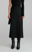 High-waisted black midi skirt featuring a front slit with sheer fabric and tailored waistband. A versatile and modern piece for elevated day-to-night looks.