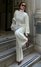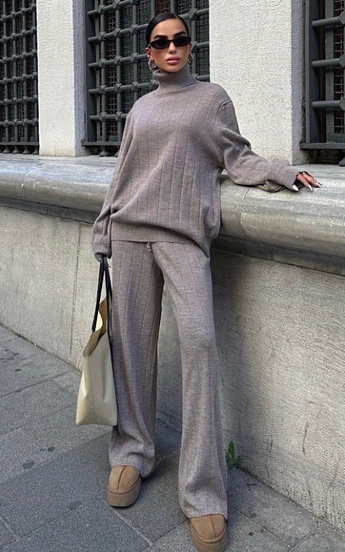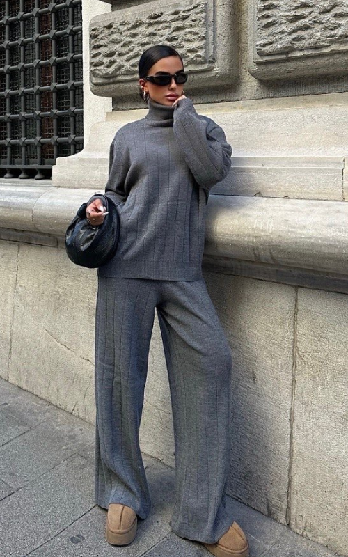 This Laura Set features a cozy high-neck collar and a sleek vertical line pattern, adding a touch of sophistication to cold-weather style.