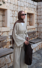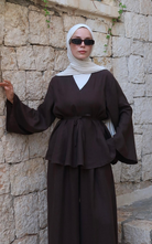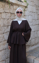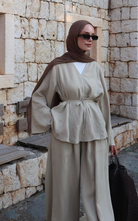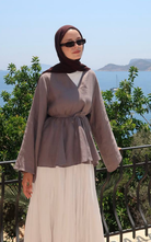 The Layal Top features a deep V-neckline, wide and flowing long sleeves and slightly flared hemline, giving it a soft A-line shape. The drawstring tie detail allows for an adjustable fit.