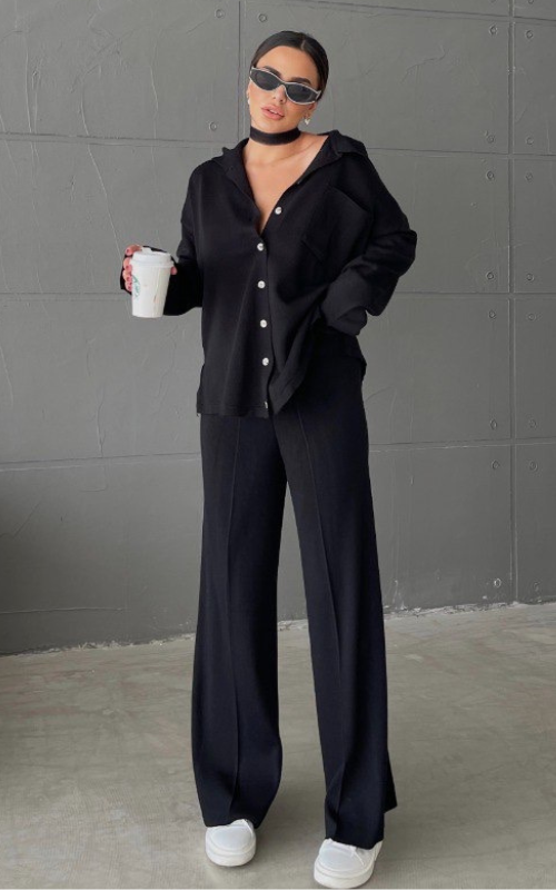 The Lelani Set features a light knit pant set paired with an oversized button-up shirt, offering a relaxed yet stylish look. Perfect for casual outings or lounging, this comfortable ensemble combines effortless elegance with versatile wearability.