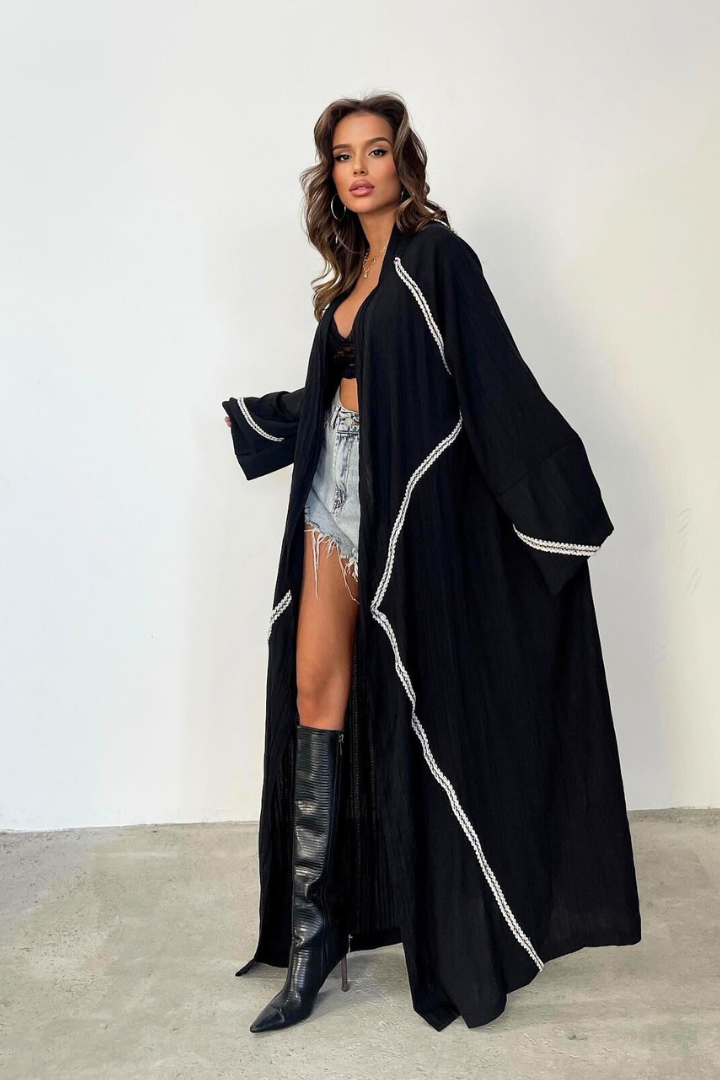 Long linen blend cardigan adorned with exquisite embroidery details, blending effortless style with timeless craftsmanship.