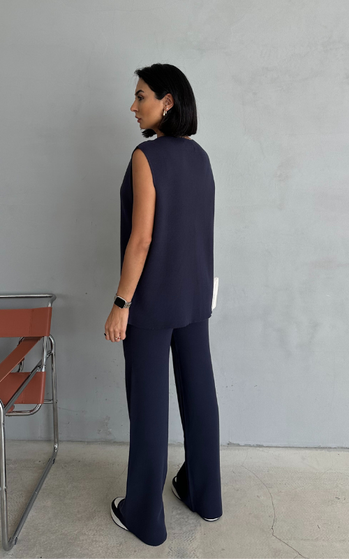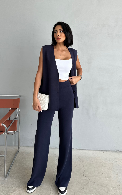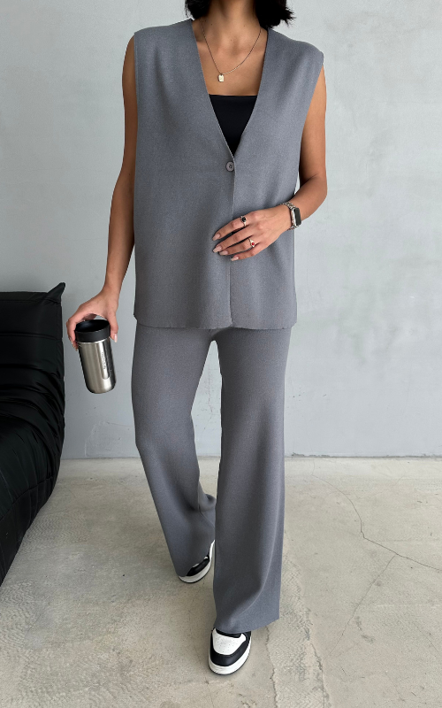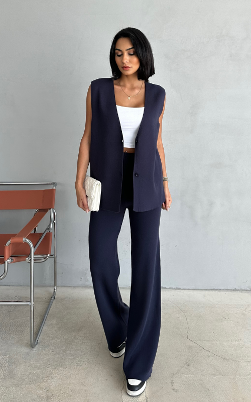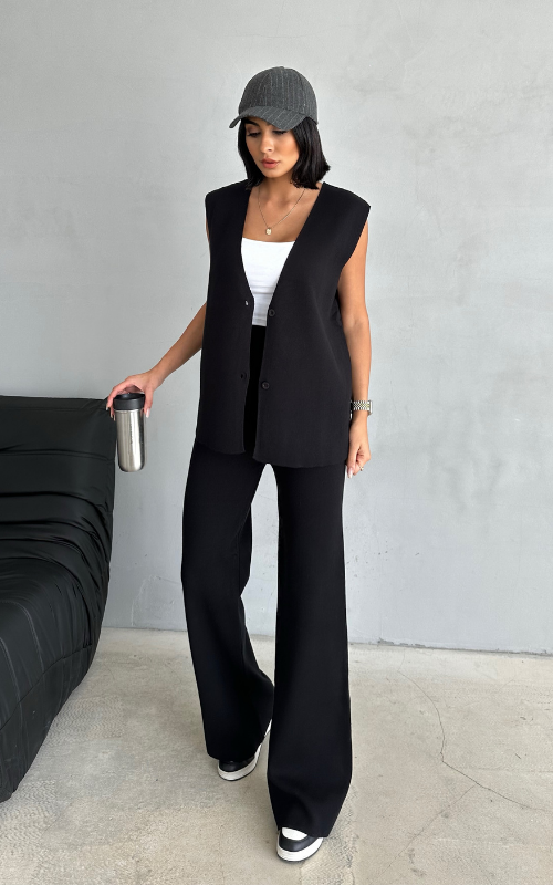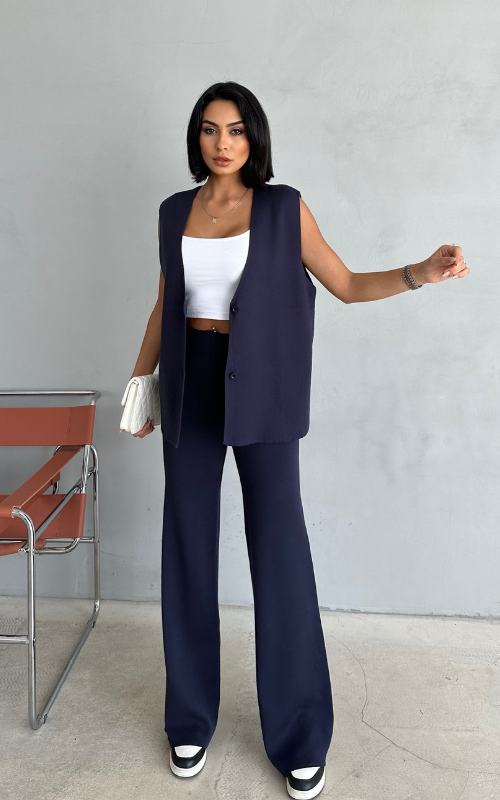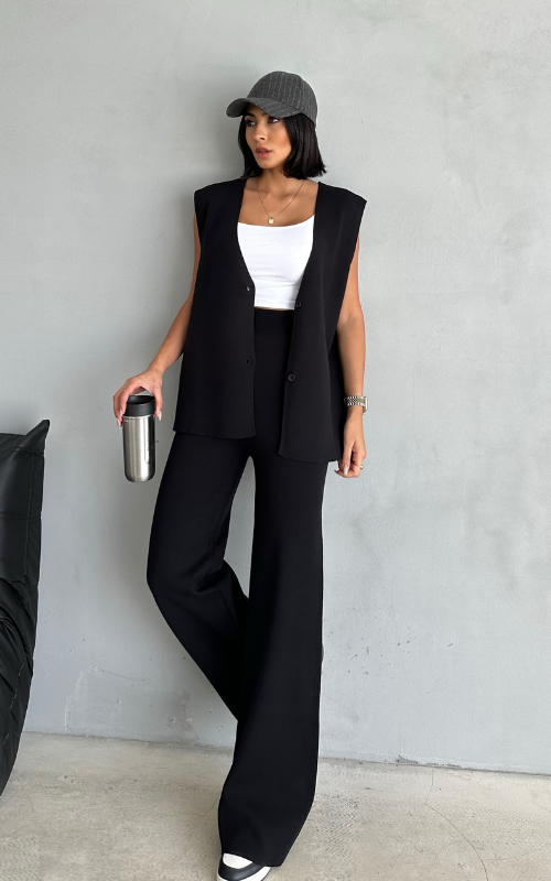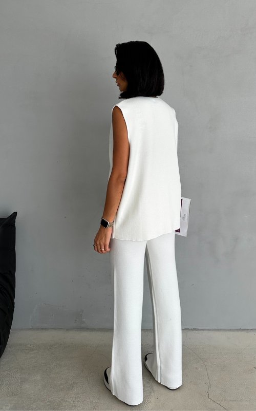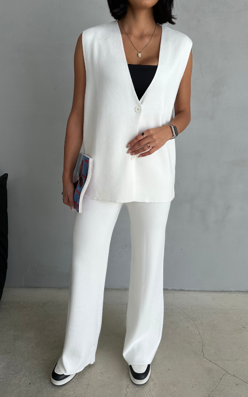 The Lila Flow Set features a light knit sleeveless V-neck top paired with flared pants, creating a breezy and stylish silhouette. Ideal for warm weather, this comfortable ensemble offers a perfect blend of casual elegance and versatility, making it a go-to choice for any occasion.