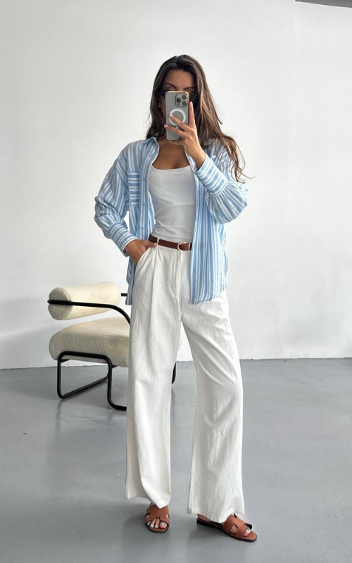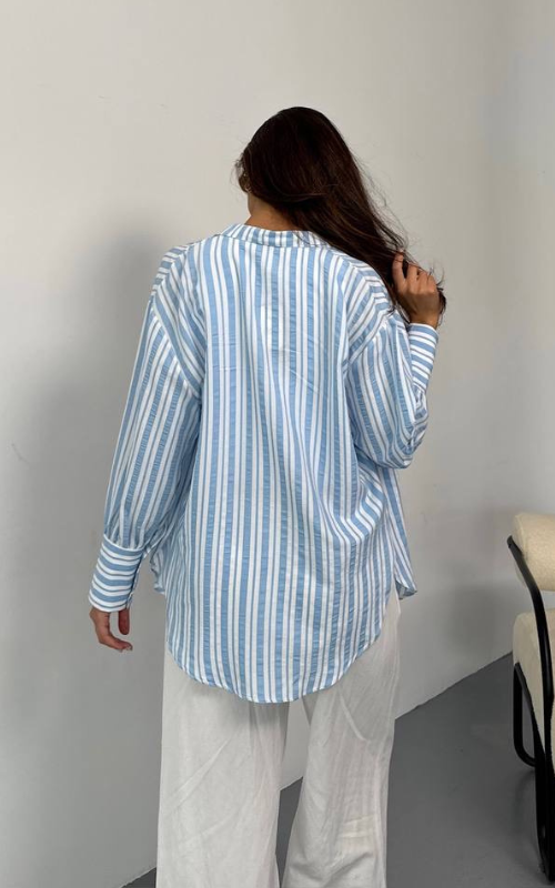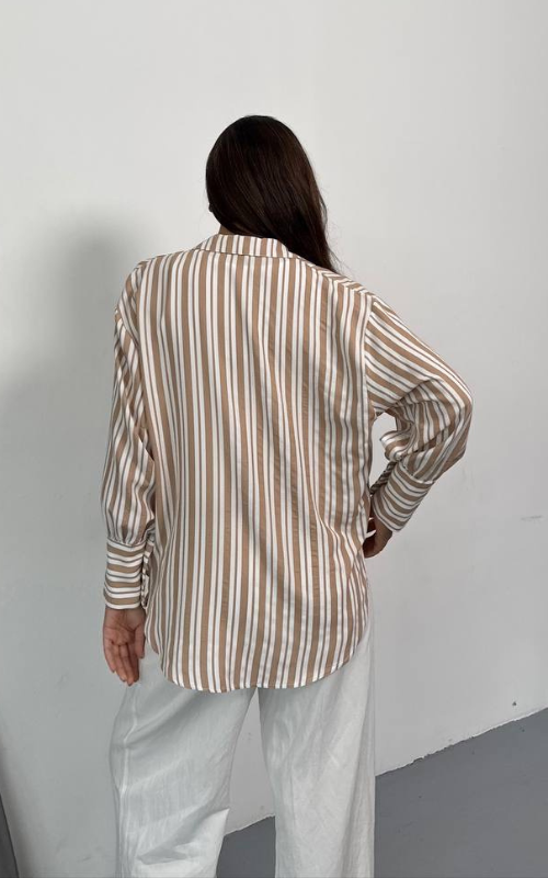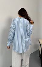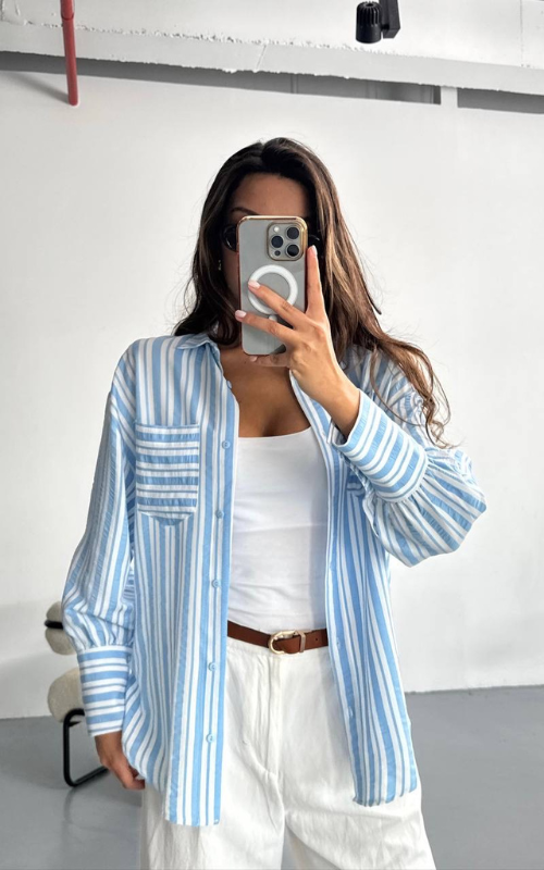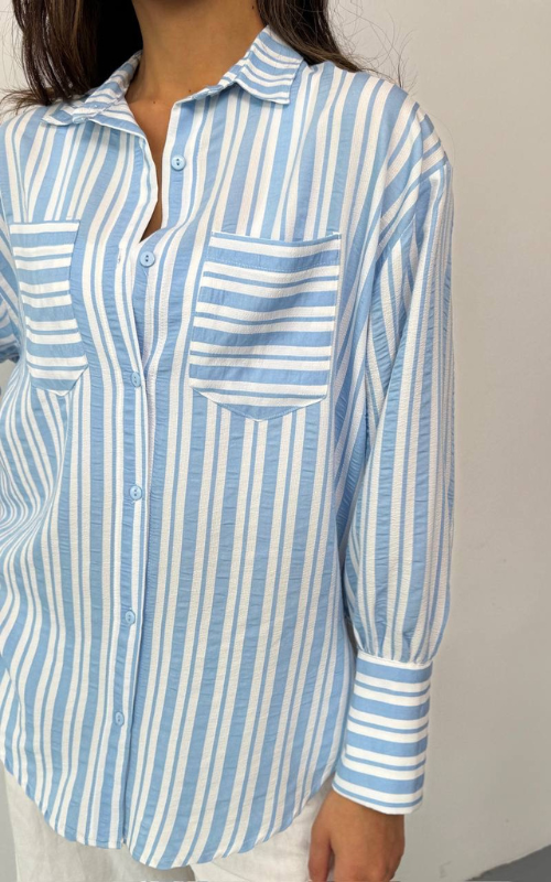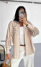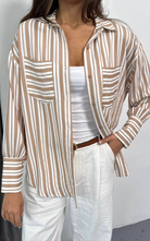 The Lina Shirt is a long-sleeved top with vertical stripes, front button closure, and contrasting horizontal stripe accents on the front pockets and wrists.