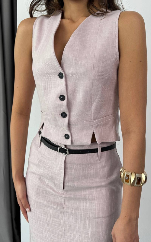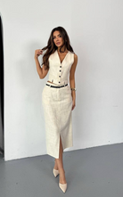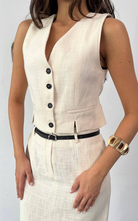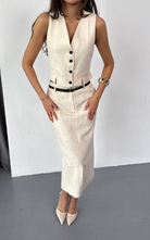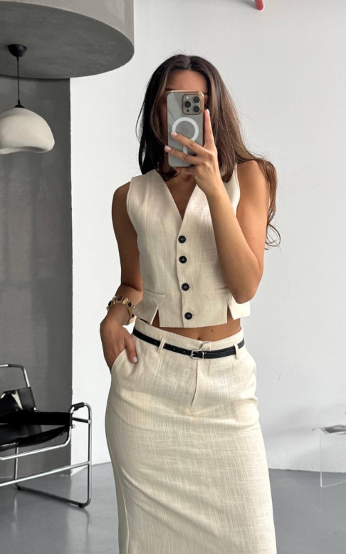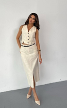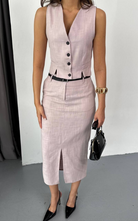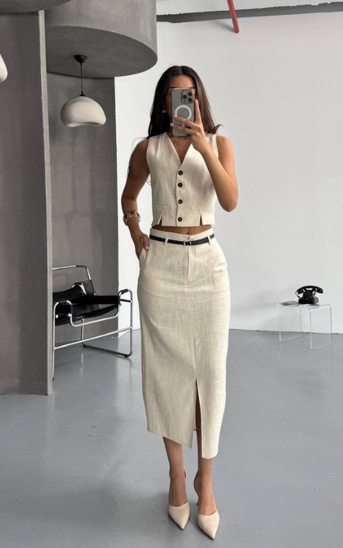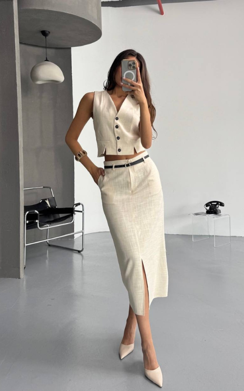 Upgrade your closet with the Liza Set, featuring a chic sleeveless vest with a bold cut-out design, paired with a sleek skirt featuring a flattering front slit and a slim leather belt.