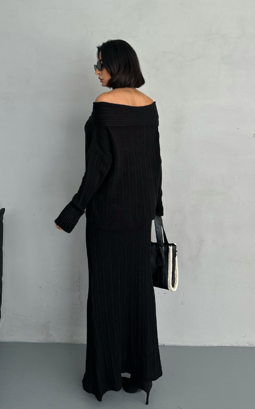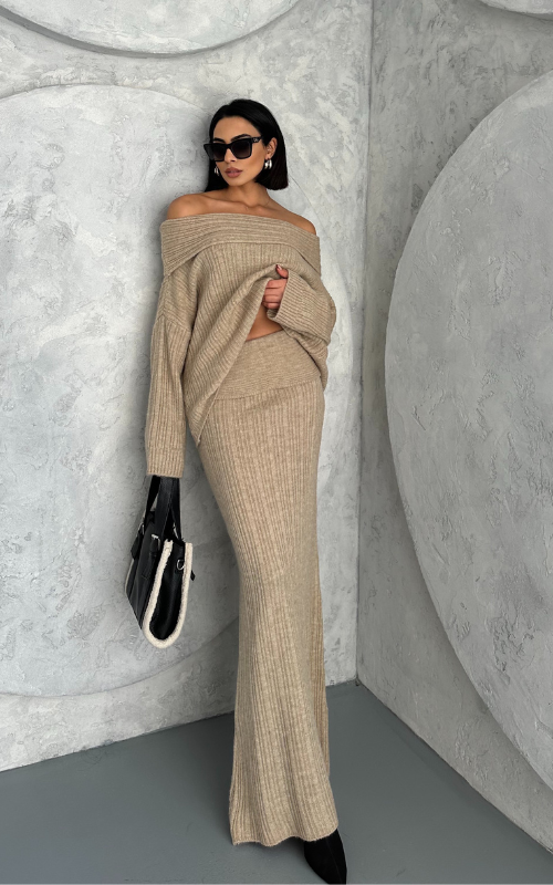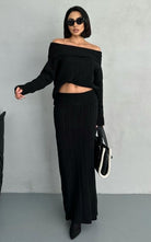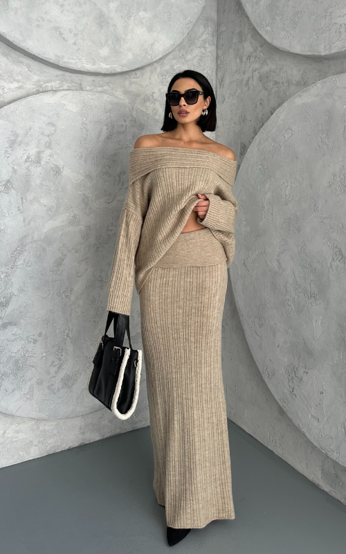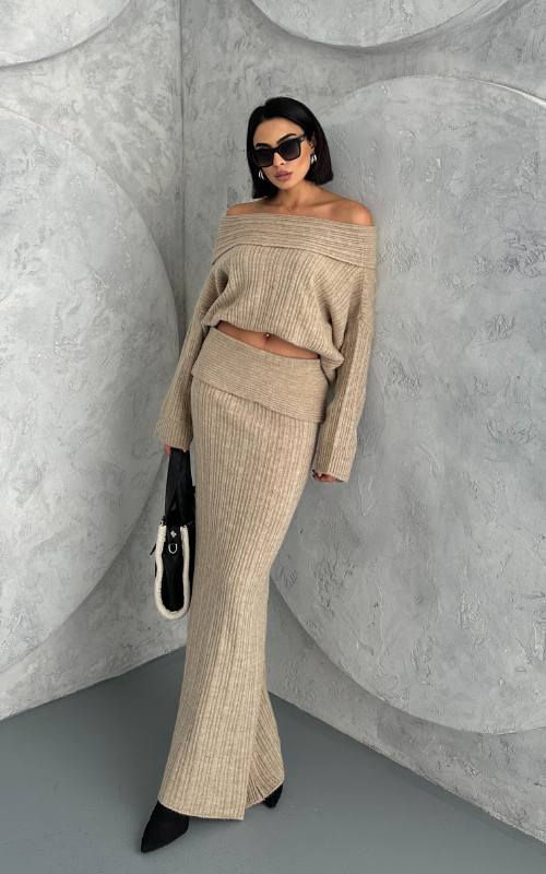 Our Lucy Set is made of cozy ribbed textured fabric, the top features a stylish off-shoulder cut while the skirt has a distinctive wide waistband to flatter your form.