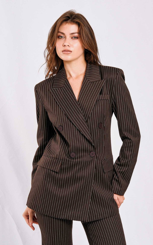 Set in pin-stripped fabric featuring a double breasted blazer with two front welt pockets; paired with a high waisted, bell bottom pant.
