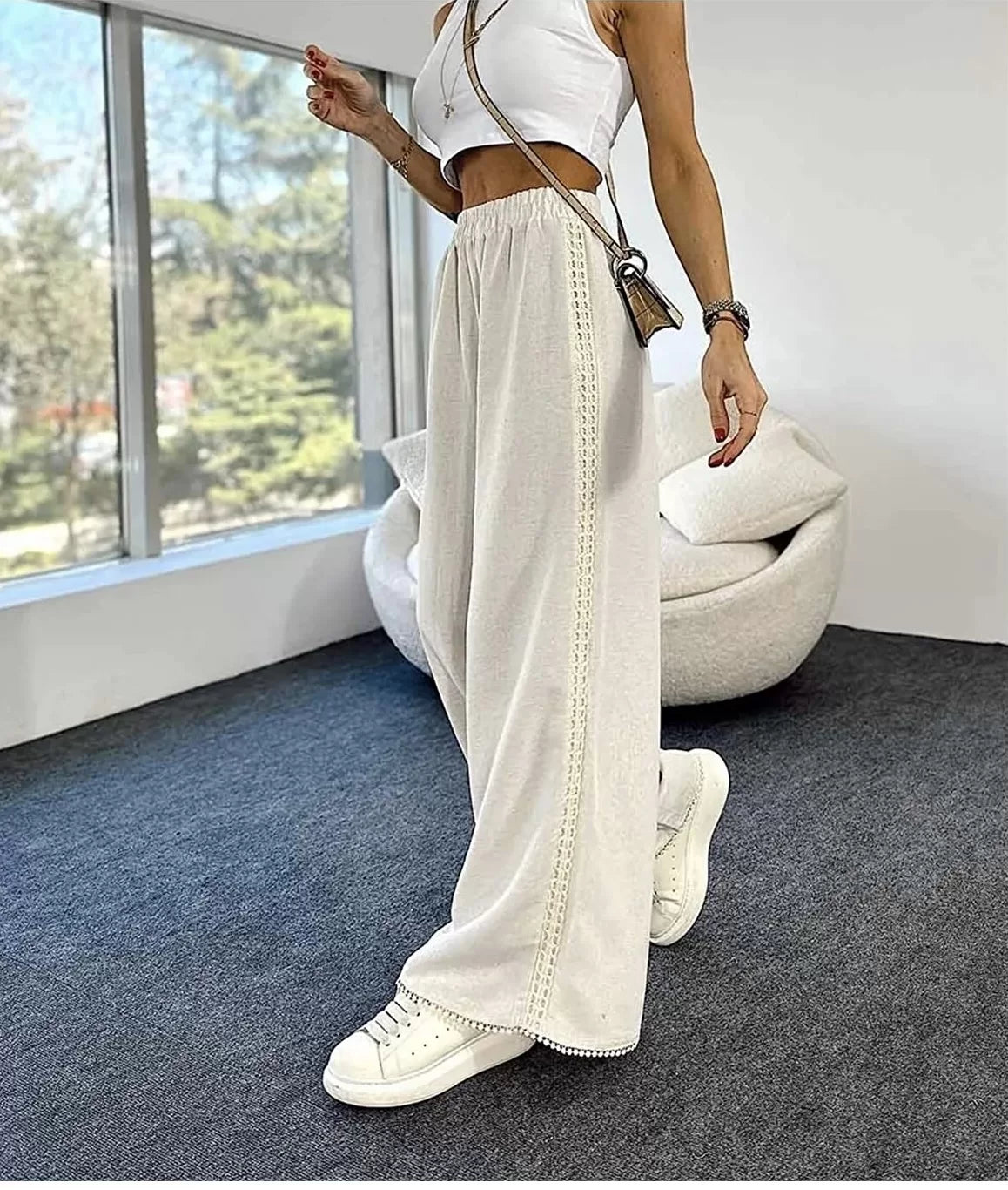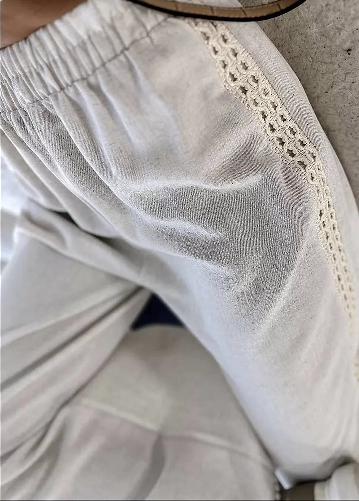 Elevate your style with our straight leg linen pants, featuring delicate embroidery along the side. Perfect blend of comfort and sophistication.