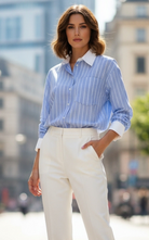 A relaxed fit button-down shirt in a pinstripe pattern and front pocket. Arm length is 3/4 with a plain white cuff and matching collar.