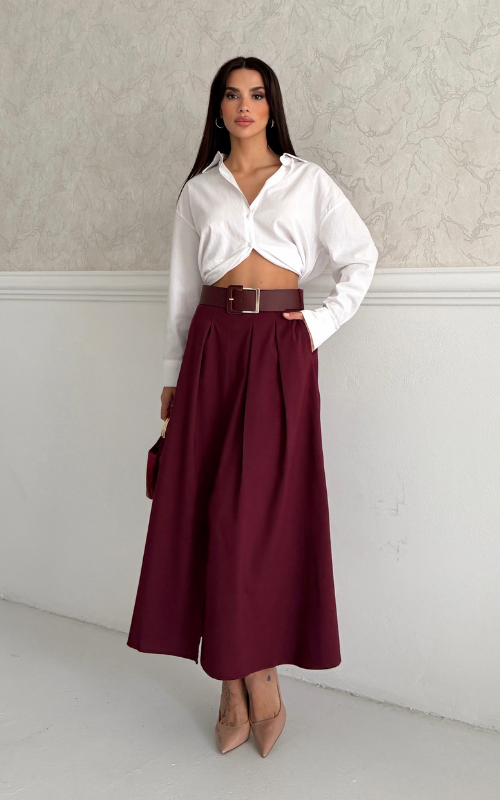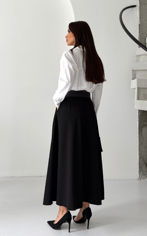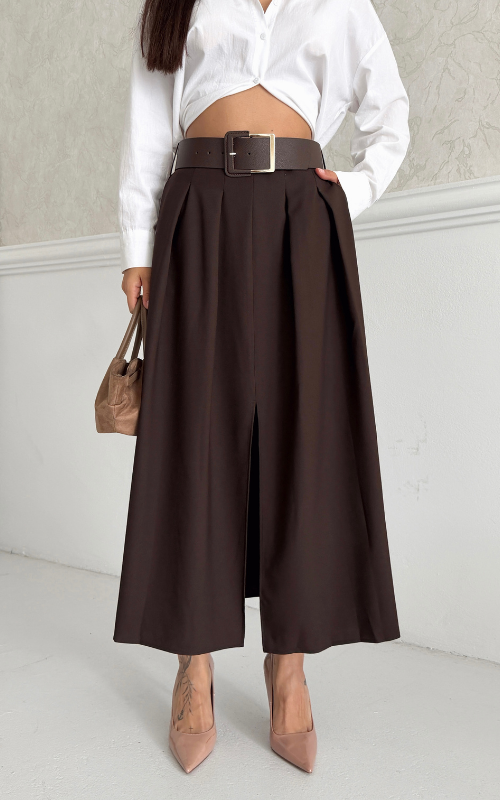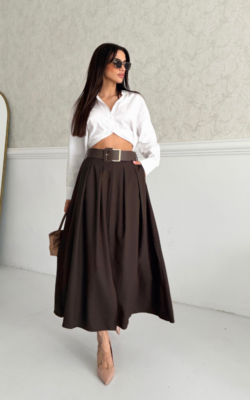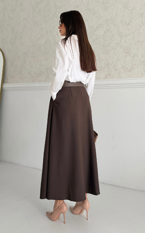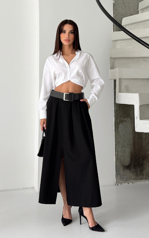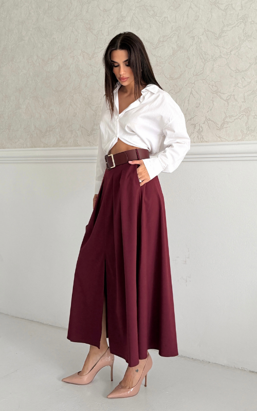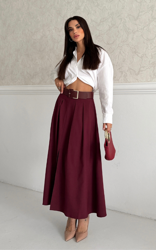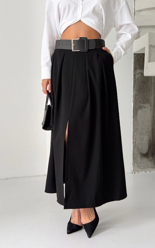 A-line, midi length skirt with front slit. Tied and accentuated with a maxi belt.