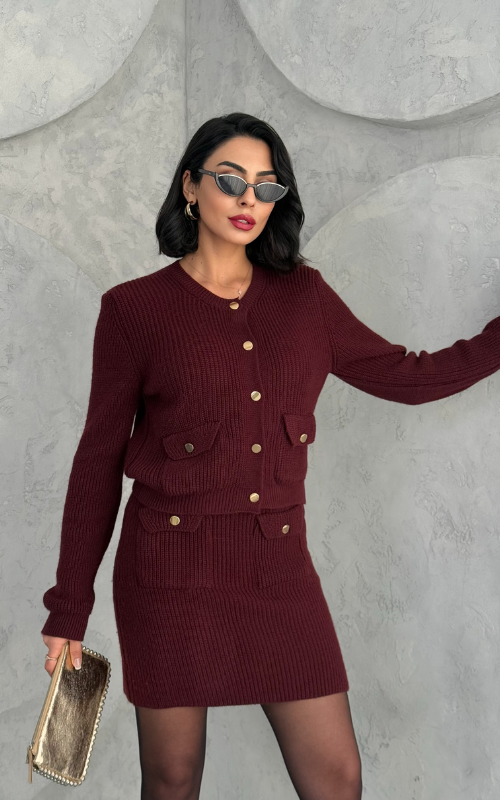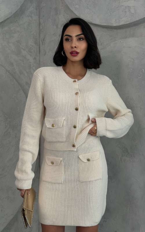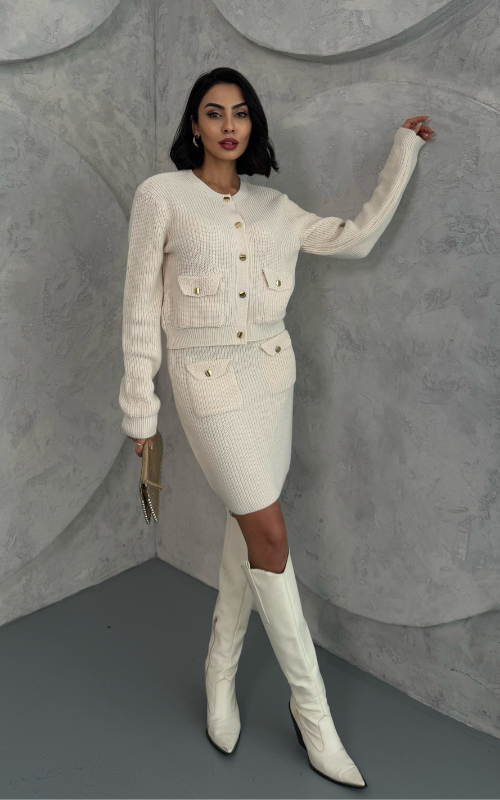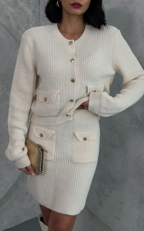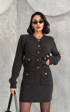 The Marlene Set features a front buttoned knit cardigan and two front pockets, paired with a matching mini skirt, also designed with two functional front pockets for a chic and coordinated look.