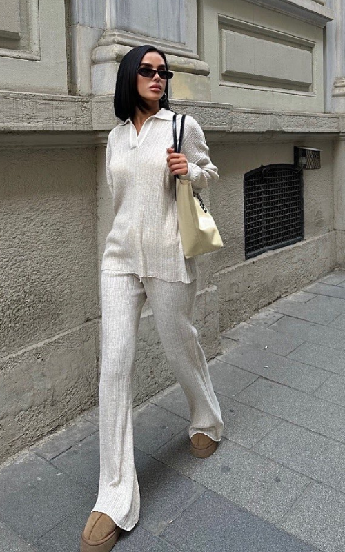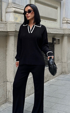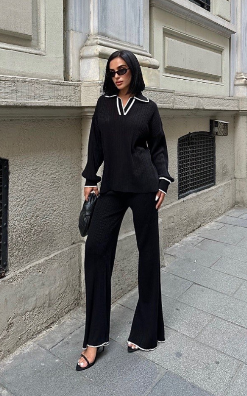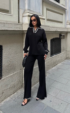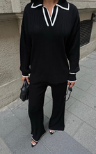 Our Mary Set is the perfect go-to for a chic and elegant look, featuring a two-tone, precisely crafted collared top and flare-cut bottoms, both made from ribbed, luxe fabric.