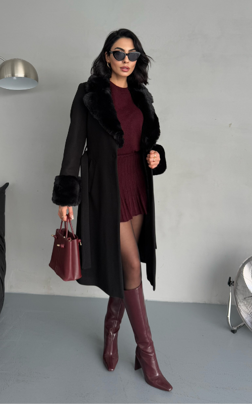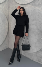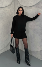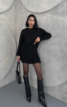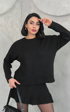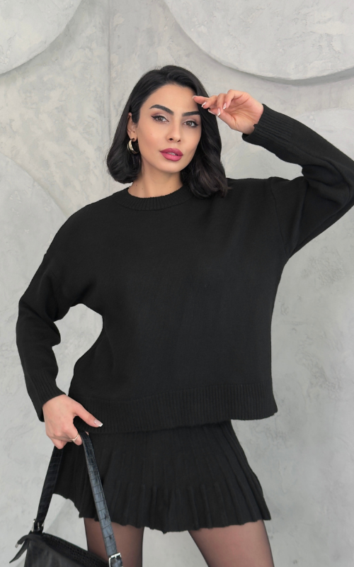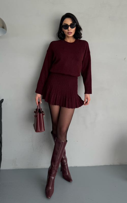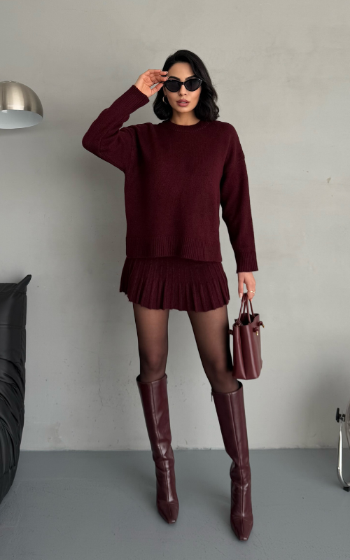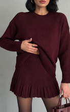 The Masha Set is a knit ribbed set that features a warm round-neck, long-sleeved top and a stylish short skirt that adds a modern touch to your wardrobe.