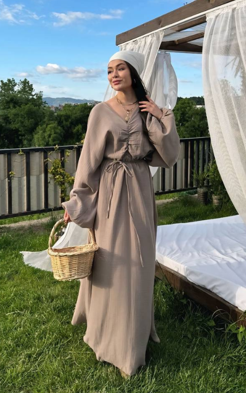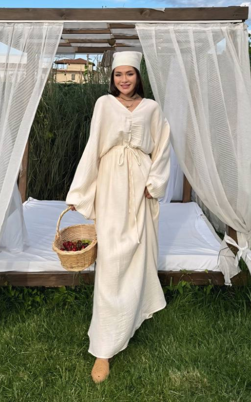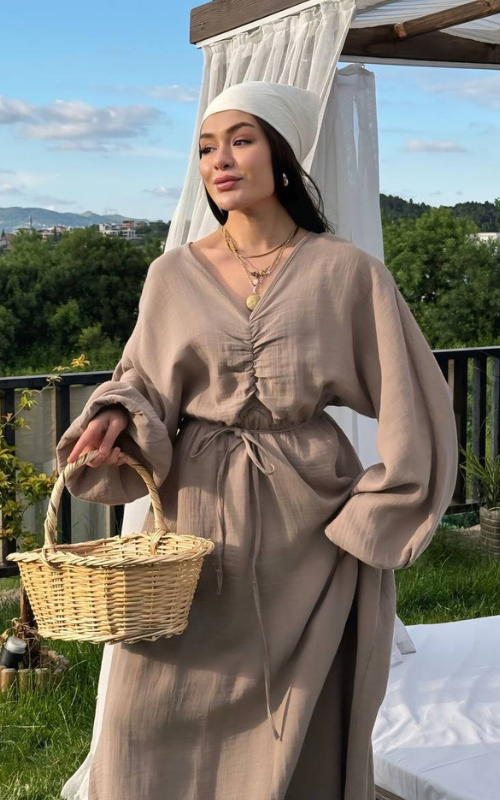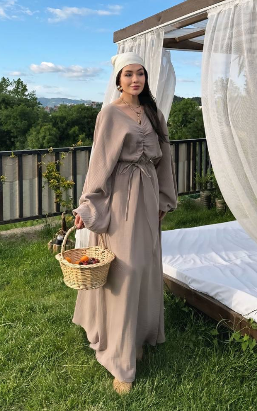 The Mira Dress is a flowy maxi dress made from breathable fabric, featuring wide long sleeves, a flattering V-neckline, a garterized waist, and a slim belt for a graceful, effortless silhouette.