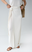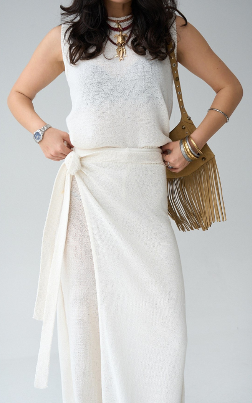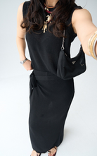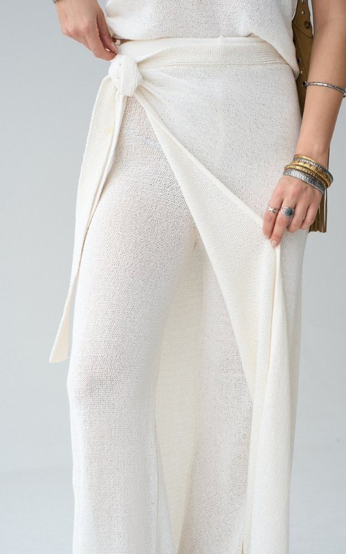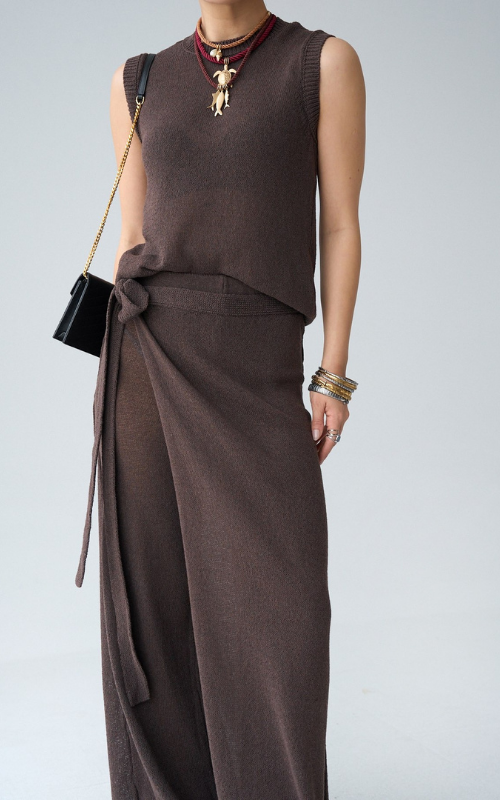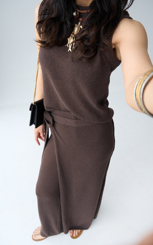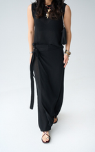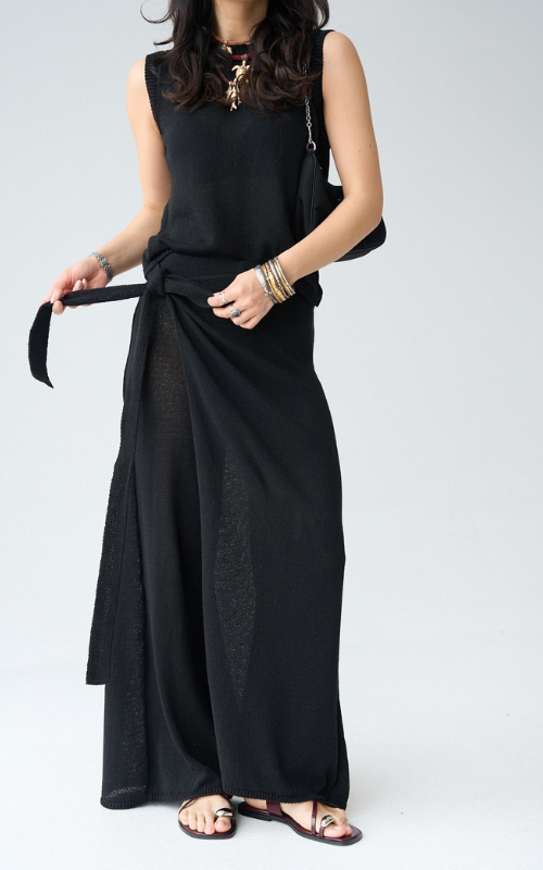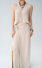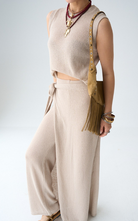 The Misha Set features a high, round neck sleeveless top paired with wide-leg pants featuring a wrap-style overlay and side tie detail, creating a relaxed yet sophisticated look.