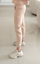 Pants with a thin elastic waistband, front side pockets, and elasticated cuffs. Made with organic cotton and a touch of elastane for comfort.