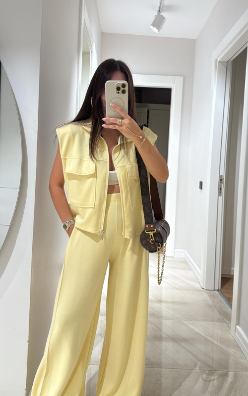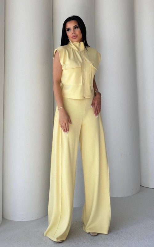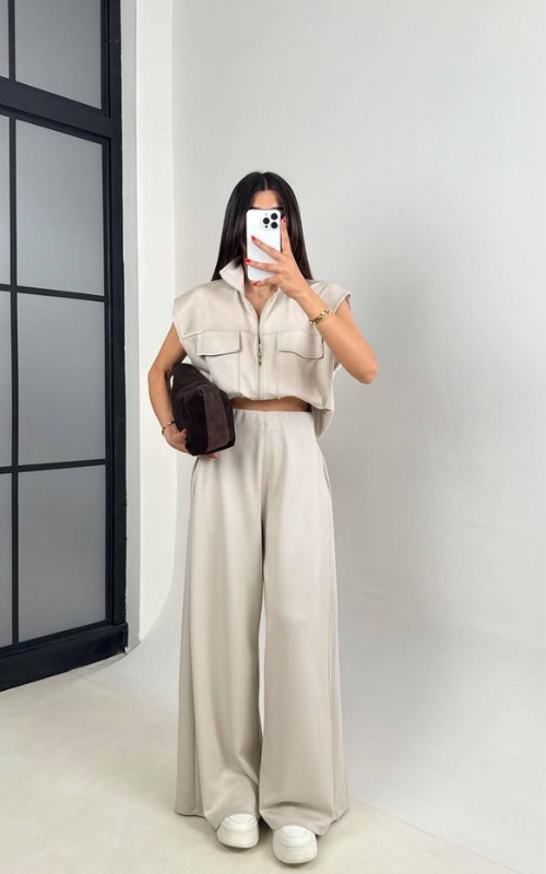 The Myth Set features a zip-up sleeveless top with structured shoulders and flap chest pockets, paired with high-waisted wide-leg trousers. Designed for comfort and effortless elegance.