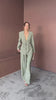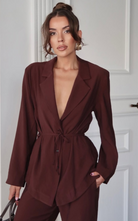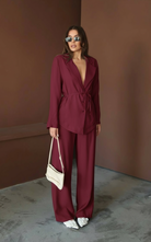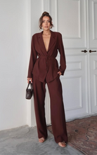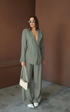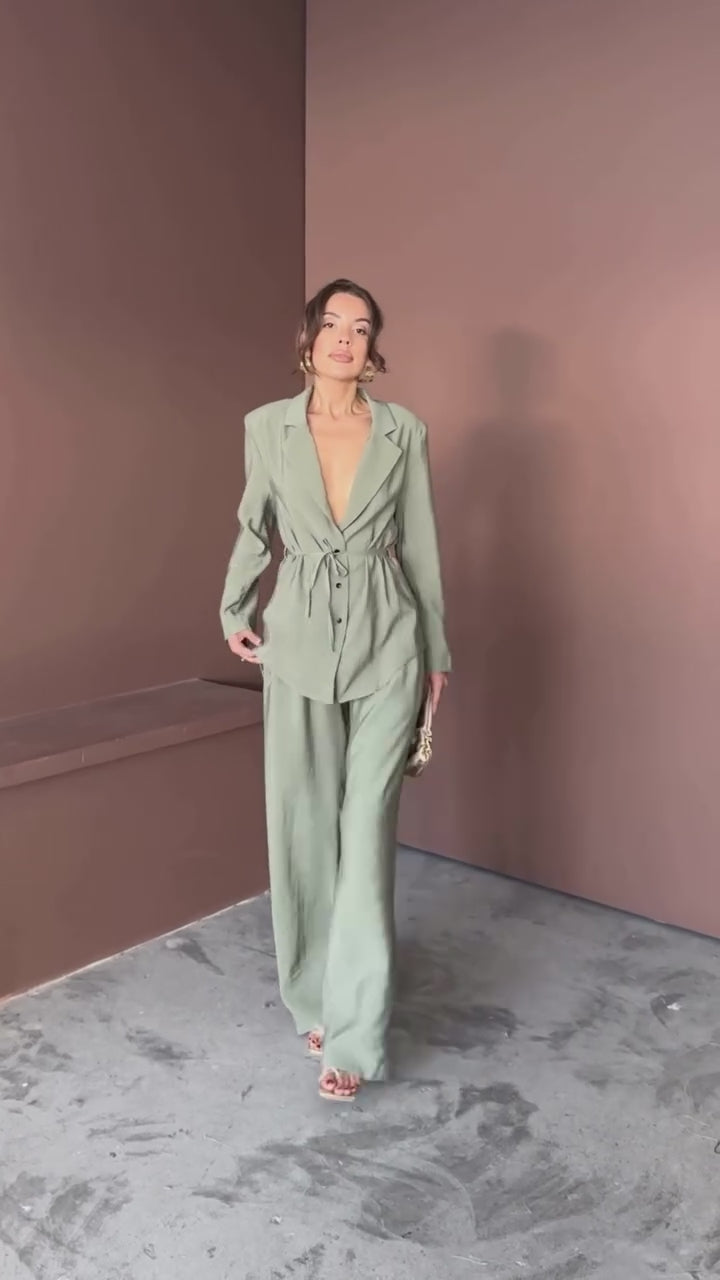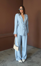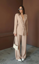 A set crafted from lightweight fabric featuring a buttoned-down blazer with a tie belt detail to enhance the waist. This is paired with a high waisted wide leg pant - creating a fresh and sophisticated look.