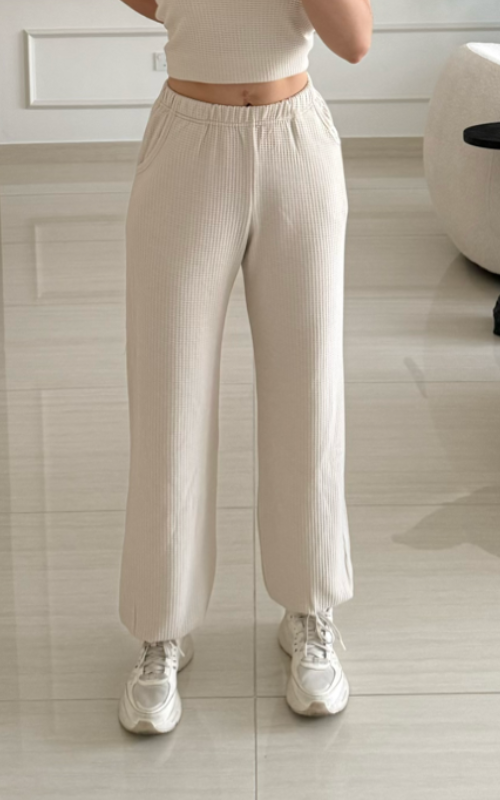 Relaxed-fit pants in waffle knit with an elasticated waistband, side pockets, and cuffed hems at the ankles for a polished yet comfortable look. The fabric contains organic cotton and elastane.