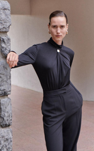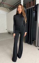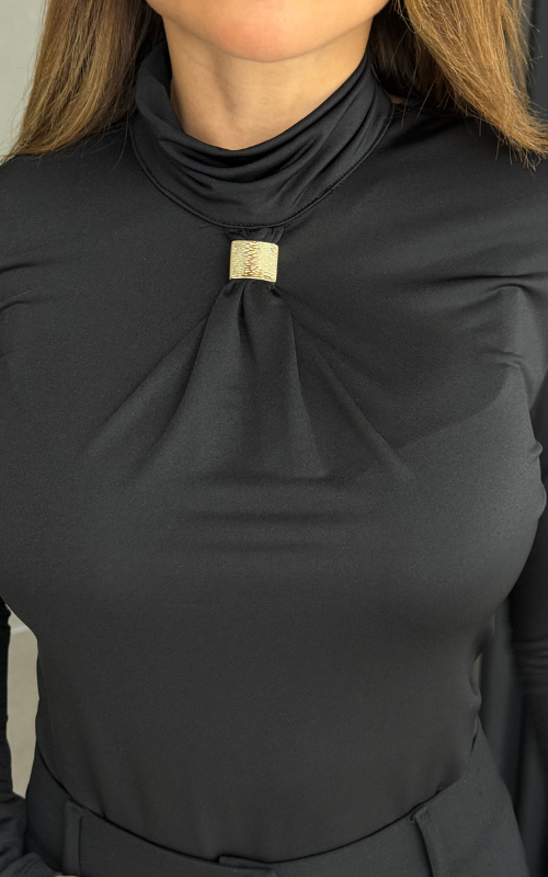 Crafted from figure-hugging elastic fabric, this high-neck, long-sleeve bodysuit stuns with refined gold detailing at the front and a daring open back that contrasts its fully covered silhouette. A bold balance of elegance and allure.
