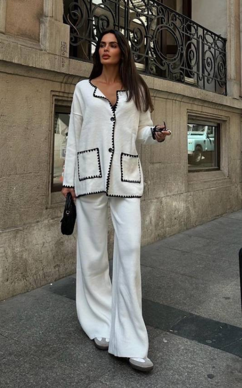 Introducing Ohana Set, this matching set features an eye-catching top detailed with intricate contrast stitches and a stylish pocket, paired with flare-cut pants. Offering warmth and modern style.