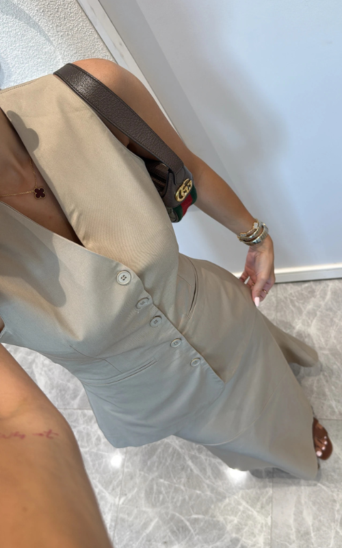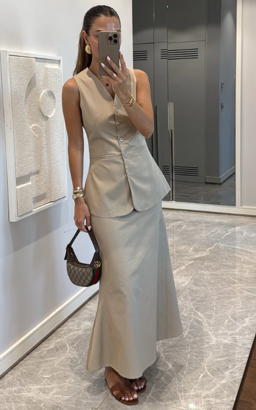 The Passion Set features a sleeveless, button-down vest with a structured fit and peplum flare. Paired with a high-waisted maxi skirt that flows elegantly and finished with a side zipper.