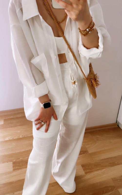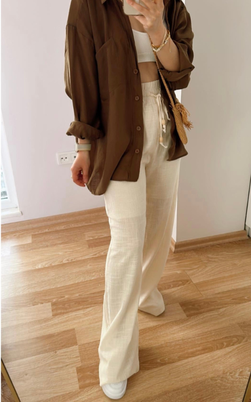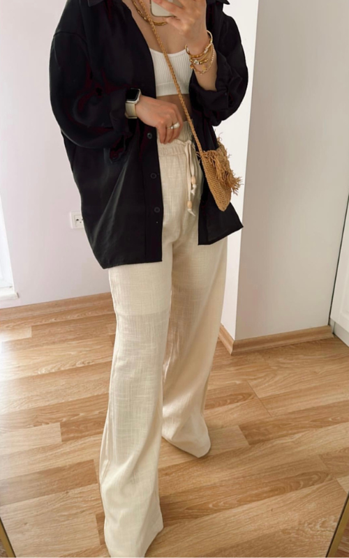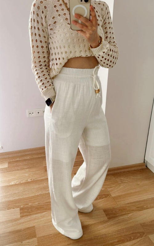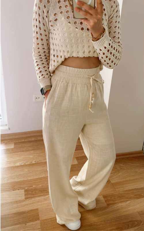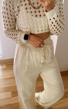 Our Pearl Pants are lightweight wide-leg trousers made from a breathable, semi-sheer textured fabric. They feature a high-rise elastic waistband and an adjustable drawstring tie with wooden bead detail.