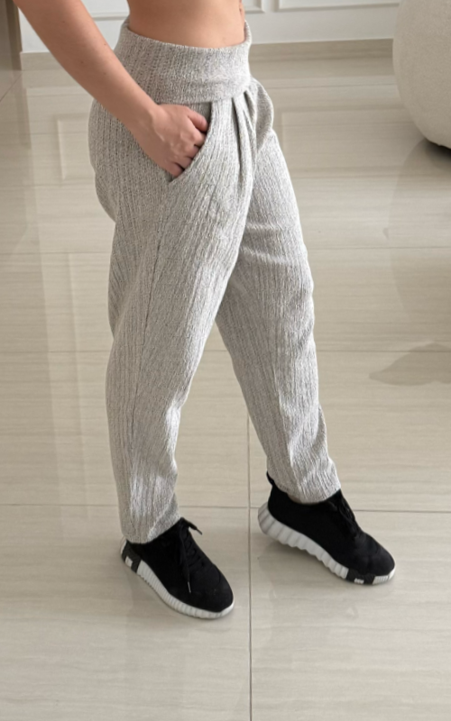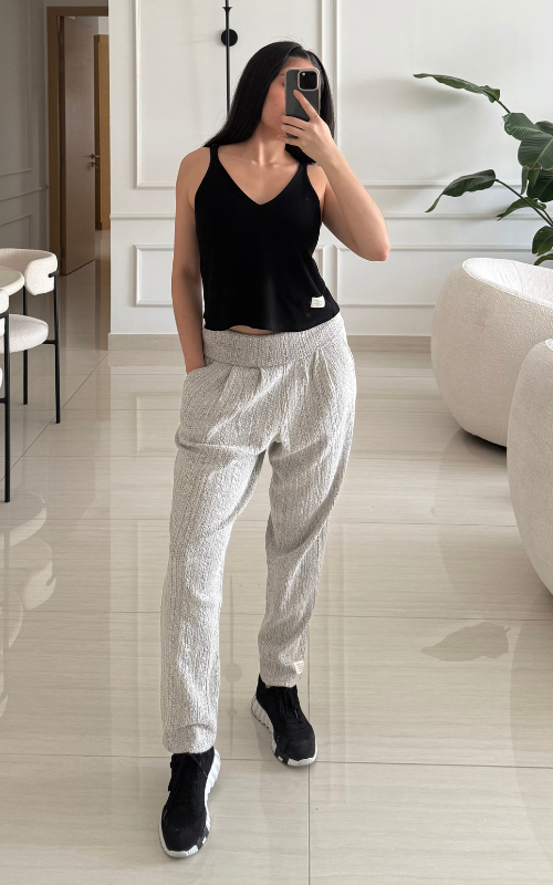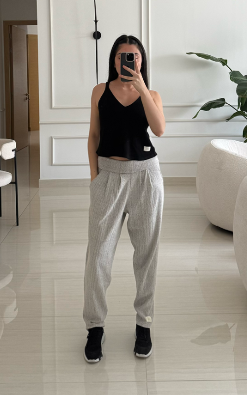 The pants feature a foldover waistband, soft pleats from the waist, and side pockets for ease. Tapered and gently cuffed at the ankles for a clean, modern silhouette. The fabric contains organic cotton and elastane.